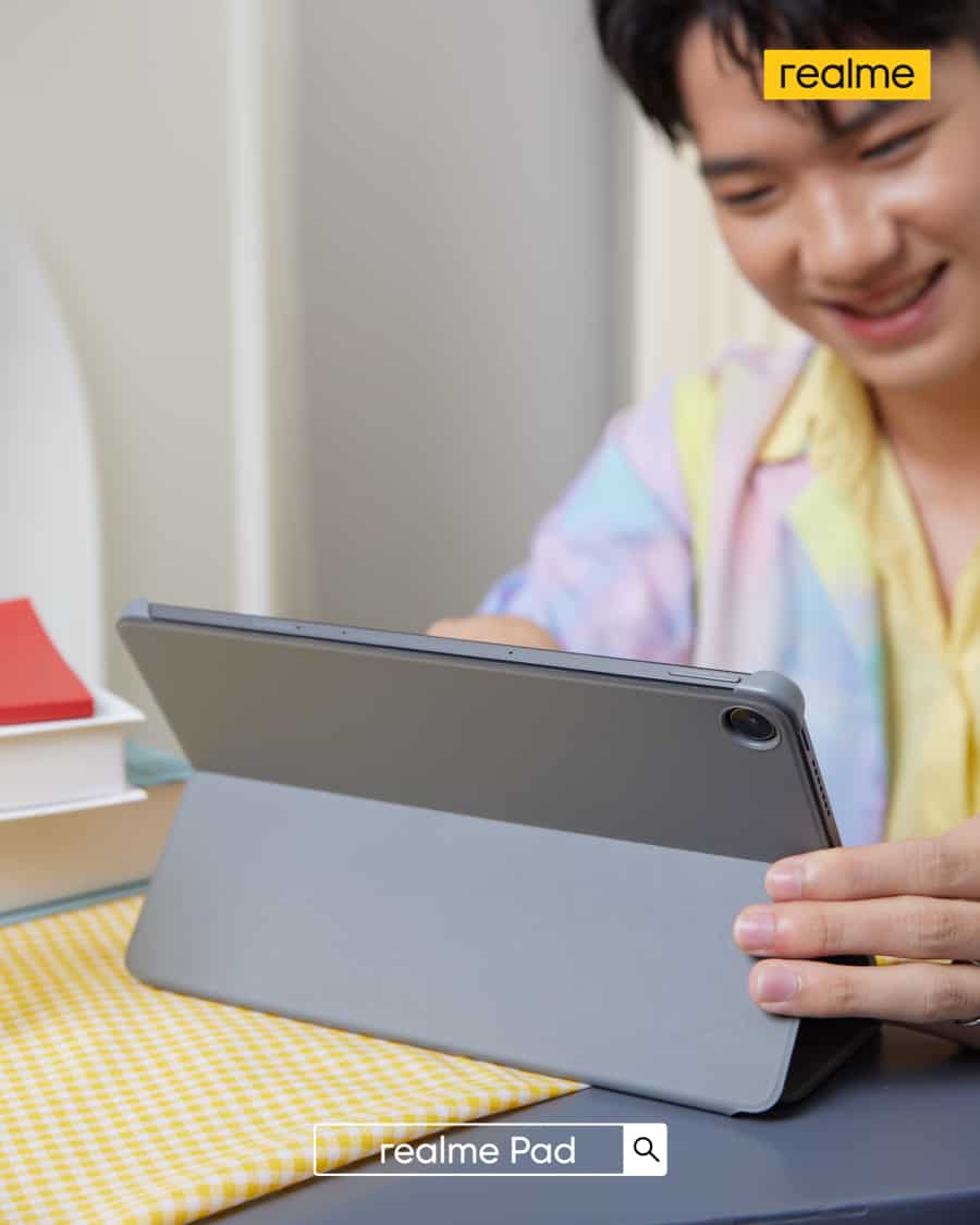 สำหรับrealme Pad มาพร้อมกับสโลแกน Ultra Slim. Real Fun ออกแบบเพื่อคนรุ่นใหม่ด้วยดีไซน์บางหรู เพียง 6.9 มม. โดดเด่นด้วยจอใหญ่ถึง 10.4 นิ้ว แบบ WUXGA+ แบตเตอรี่ขนาดใหญ่ 7100 มิลลิแอมป์ พร้อมลำโพงเกรดพรีเมียม 4 ตัว กับเทคโนโลยี Dolby Atmos และที่สำคัญคือฟีเจอร์กล้องหน้า Ultra-wide มุมมองกว้างถึง 105 องศา ขับเคลื่อนด้วยขุมพลัง Octa-core Helio G80 และ GPU Mali G52 ซึ่งเป็นชิปเซ็ตระดับเกมมิ่ง ทำให้ realme Pad รองรับการทำงานของแอปต่าง ๆ ได้อย่างไหลลื่น มอบอัตราเฟรมเรตที่เสถียรทั้งในการเล่นเกมและการดูคอนเทนต์ทุกรูปแบบ