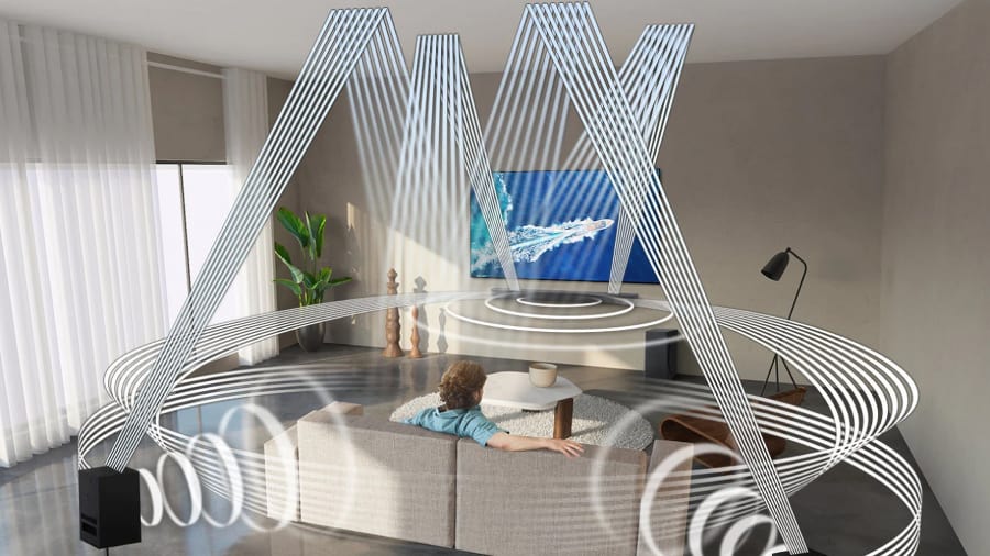 ซัมซุงได้ใช้เทคโนโลยี Dolby Atmos จำลองประสบการณ์เสียงในโรงภาพยนตร์มาไว้ที่บ้านคุณ ด้วยซัมซุงซาวด์บาร์ (HW-Q950A/XT) ที่มาพร้อมกับลำโพง 11 ช่องทาง, ซับวูฟเฟอร์ 1 ช่องทาง และลำโพงยิงเสียงขึ้นด้านบนอีก 4 ช่องทาง (11.1.4ch) สร้างเสียงแบบ 3 มิติ ทำให้เสียงเคลื่อนไหวได้อย่างมีชีวิตเพื่อการรับชมความบันเทิงที่สมจริงยิ่งกว่า และยกระดับไปอีกขั้นด้วยนวัตกรรม SpaceFit Sound+ และ Auto EQ ที่วิเคราะห์ห้องของคุณเพื่อสร้างคลื่นเสียงที่เหมาะสมกับบ้านของคุณโดยเฉพาะ ช่วยให้คุณสามารถสัมผัสได้ถึงการเคลื่อนไหวของวัตถุ ไปจนถึงเสียงของฝนที่ตกกระทบหลังคาได้อย่างสมจริง