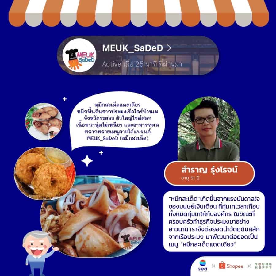 นายสำราญ รุ่งโรจน์ เจ้าของร้านหมึกสะเด็ด เผยถึงความรู้สึกหลังได้รับรางวัลนักขายวัยเก๋าว่า “แต่เดิมนั้นร้านหมึกสะเด็ดตั้งอยู่ที่เกาะเสม็ด ซึ่งตั้งแต่ที่เจอสถานการณ์โควิด-19 จึงทำให้ทุกอย่างหยุดชะงัก เราก็พยายามหาช่องทางที่จะทำให้กิจการของเราอยู่รอด เพื่อที่จะดูแลพนักงานและครอบครัวเราต่อไป เมื่อได้มาเจอโครงการนี้ก็ทำให้เรายิ้มได้อีกครั้ง เพราะก่อนหน้านี้ไม่เคยลงขายสินค้าผ่านทางออนไลน์เลย แต่หลังจากที่ได้เข้าร่วมเรียนคอร์สขายได้ขายดีกับ Shopee ก็ได้นำความรู้ที่ได้ไปเปิดร้านในช่องทางออนไลน์ต่าง ๆ รวมถึงช้อปปี้ ทำให้มีคนรู้จักมากขึ้นและมีรายได้เข้ามาจนเห็นลู่ทางที่จะฝ่าฟันวิกฤติได้ในตอนนี้ จึงอยากฝากถึงเพื่อน ๆ วัยเก๋าทุกท่านว่าอย่าหยุดที่จะเรียนรู้ เหตุการณ์ไม่คาดฝันนั้นสามารถเกิดขึ้นได้ตลอดทางที่เราเดิน เราต้องเป็นน้ำที่ไม่เต็มแก้ว เปิดใจเรียนรู้สิ่งใหม่ ๆ และทุกคนจะสามารถก้าวผ่านปัญหาเหล่านั้นไปได้”
