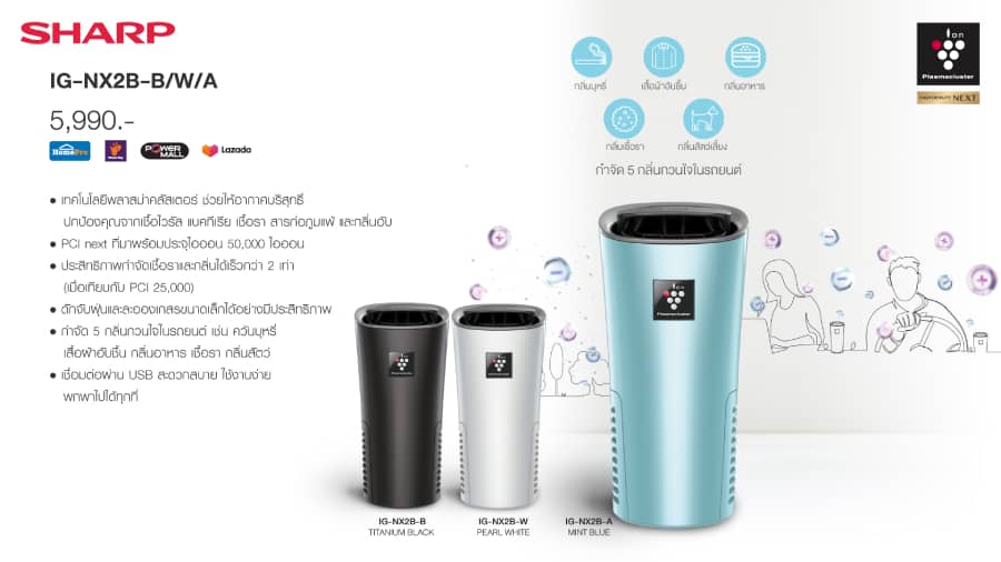 และจากสภาวะการระบาดของเชื้อไวรัสโคโรน่า รวมถึงปัญหามลพิษทางอากาศที่เป็นอันตรายต่อสุขภาพ ชาร์ปจึงพัฒนา 2 ผลิตภัณฑ์รุ่นใหม่ล่าสุด ได้แก่ เครื่องฟอกอากาศในรถยนต์ (Iron Generator) รุ่น IG-NX2B มาพร้อมเทคโนโลยีใหม่ Plasmacluster NEXT ที่มีประสิทธิภาพในการกระจายพลาสม่าคลัสเตอร์ไอออนได้มากถึง 50,000 ไอออน ช่วยให้อากาศบริสุทธิ์ ปกป้องเชื้อไวรัส แบคทีเรีย เชื้อรา สารก่อภูมิแพ้ และกลิ่นอับ ให้ประสิทธิภาพกำจัดเชื้อราและกลิ่นได้เร็วกว่า 2 เท่า (เมื่อเทียบกับ PCI 25,000) ดักจับฝุ่นและละอองเกสรขนาดเล็กได้อย่างมีประสิทธิภาพกำจัด 5 กลิ่นกวนใจในรถยนต์ เช่น ควันบุหรี่ เสื้อผ้าอับชื้น กลิ่นอาหาร เชื้อรา กลิ่นสัตว์ ใช้งานง่าย สามารถเชื่อมต่อผ่าน USB สะดวกสบาย พกพาไปได้ทุกที่ ราคา 5,990 บาท เริ่มจำหน่ายตั้งแต่เดือนธันวาคม 2564 เป็นต้นไป