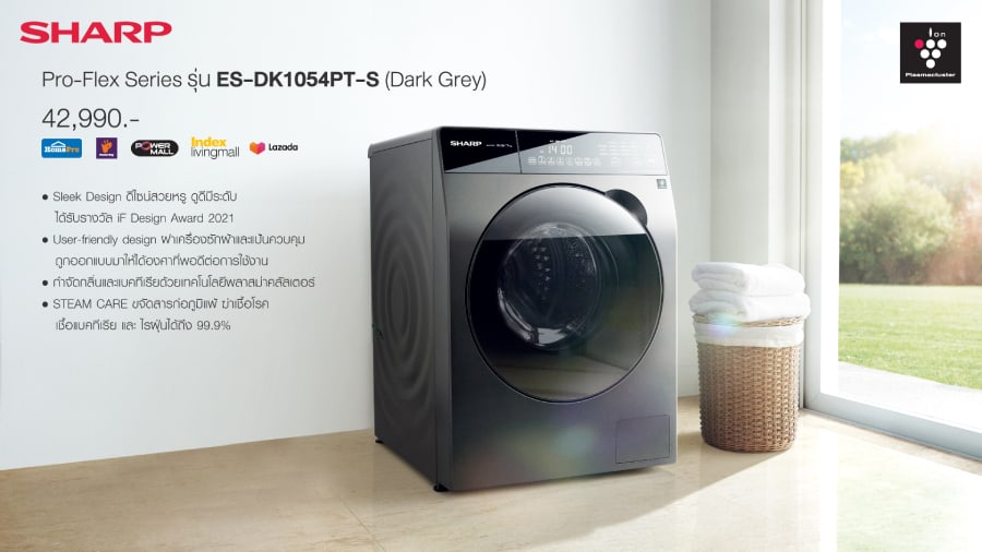 นอกจากนี้ ชาร์ปยังส่งเครื่องซักผ้า Pro-Flex Series รุ่น ES-DK1054PT-S ที่สามารถกำจัดกลิ่นและแบคทีเรียด้วยเทคโนโลยีพลาสม่าคลัสเตอร์ มีฟังก์ชั่นอบไอน้ำ และโปรแกรมกำจัดสารก่อภุมิแพ้ ฆ่าเชื้อโรคและไรฝุ่นบ้านได้ถึง 99.9% และกำจัดแบคทีเรีย โดยฝาเครื่องซักผ้าและแป้นควบคุมถูกออกแบบมาให้ได้องศาที่พอดีต่อการใช้งาน ดีไซน์สวยหรู ได้รับรางวัล IF Design Award 2021 จากประเทศเยอรมนีอีกด้วย ราคา 42,990 บาท เริ่มจำหน่ายในเดือนพฤศจิกายนนี้
