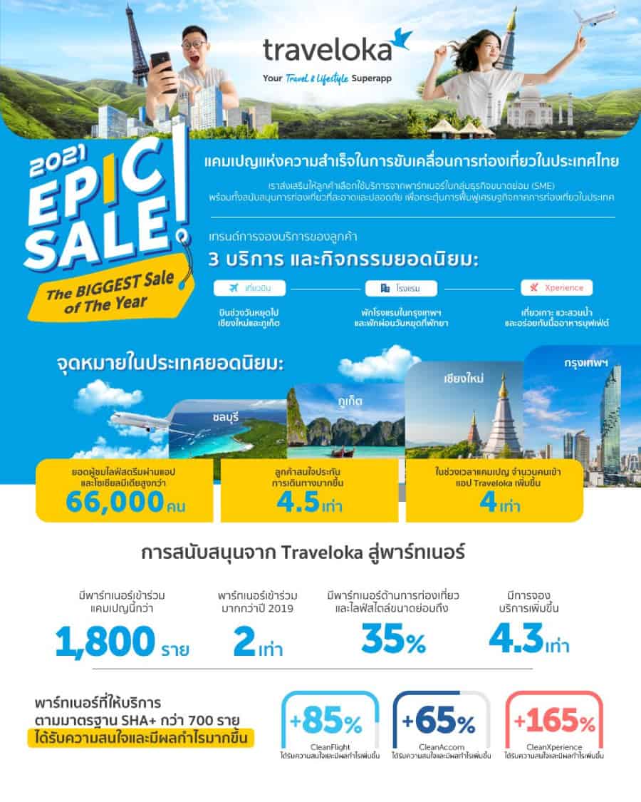 Traveloka เผยแคมเปญ EPIC Sale 2021 ช่วยฟื้นการท่องเที่ยวในไทย พาร์ตเนอร์ด้านการท่องเที่ยวกว่า 1,800 รายเข้าร่วมแคมเปญ EPIC Sale ครั้งที่สองในไทย ดันยอดจองเพิ่มขึ้น 4.5 เท่า และจำนวนการใช้งานสูงขึ้น 4 เท่าในช่วงแคมเปญ