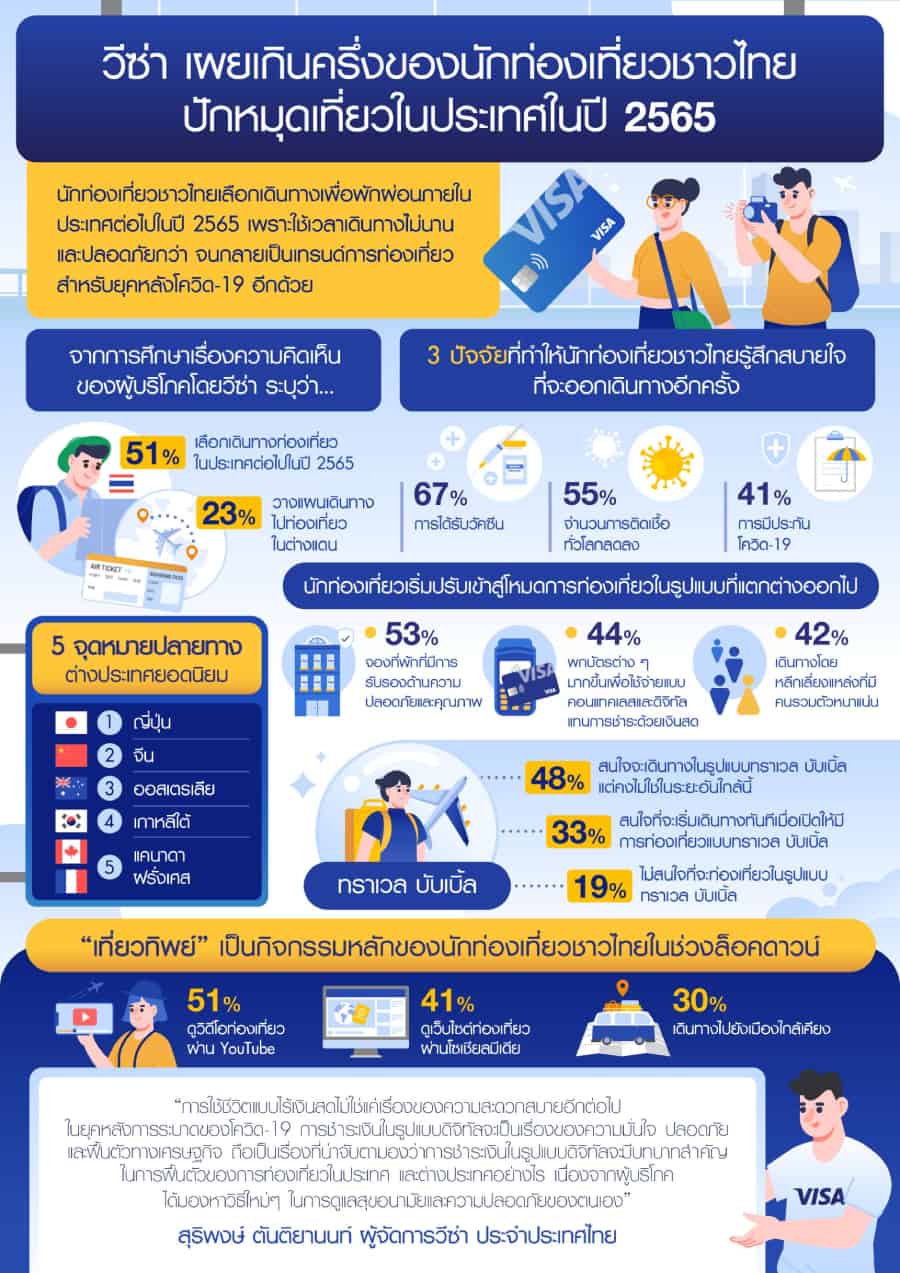VISA เผยนักท่องเที่ยวชาวไทยยังคงเลือกเดินทางเพื่อพักผ่อนภายในประเทศต่อไปในปี 2565 เพราะใช้เวลาเดินทางไม่นานและมีความปลอดภัยกว่า จนกลายเป็นเทรนด์การท่องเที่ยวสำหรับยุคหลังโควิด-19 นี้อีกด้วย โดยจากการศึกษาเรื่องความคิดเห็นของผู้บริโภคโดยวีซ่า พบว่ามากกว่าครึ่งของผู้ทำแบบสำรวจชาวไทย (51 เปอร์เซ็นต์) มีแนวโน้มจะเลือกเดินทางท่องเที่ยวภายในประเทศ ต่อไปจนถึงปีหน้า ขณะที่ 23 เปอร์เซ็นต์ มีการวางแผนเดินทางไปท่องเที่ยวในต่างแดน