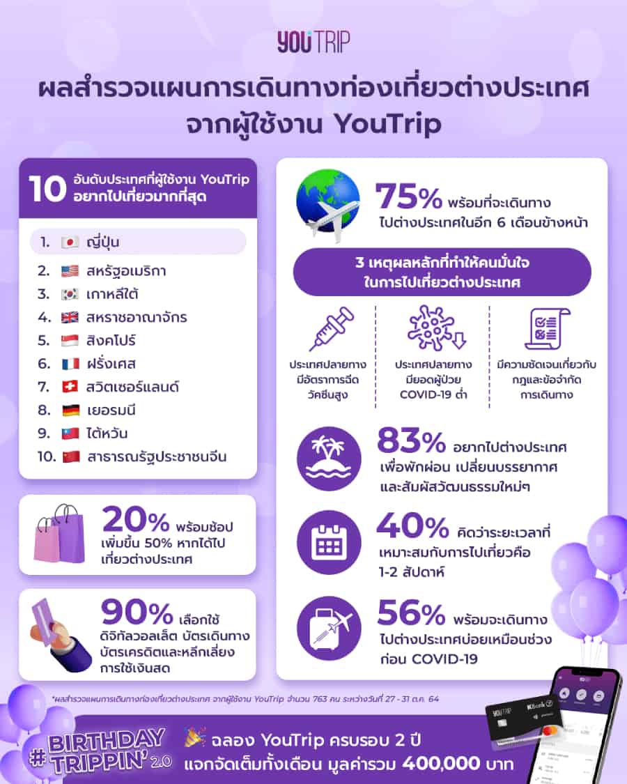 YouTrip (ยูทริป) ผู้ให้บริการ ดิจิทัลวอลเล็ต รองรับหลายสกุล (Multi-currency wallet) ร่วมกับธนาคารกสิกรไทย เผยผลสำรวจแผนการเดินทางท่องเที่ยวต่างประเทศจากผู้ใช้งาน [1] พบคนไทย 7 ใน 10 คนพร้อมออกเดินทางไปต่างประเทศอีกครั้งใน 6 เดือนข้างหน้า โดยจุดหมายหลัก 3 อันดับแรก คือ ประเทศญี่ปุ่น สหรัฐอเมริกา และเกาหลีใต้ ผลสำรวจนี้จัดทำขึ้นในโอกาสครบรอบ 2 ปีการให้บริการ YouTrip ในประเทศไทยเพื่อสำรวจความต้องการเดินทางไปเที่ยวต่างประเทศอีกครั้งภายหลังสถานการณ์การแพร่ระบาดของโรคโควิด-19 ทั่วโลกเริ่มคลี่คลายลง