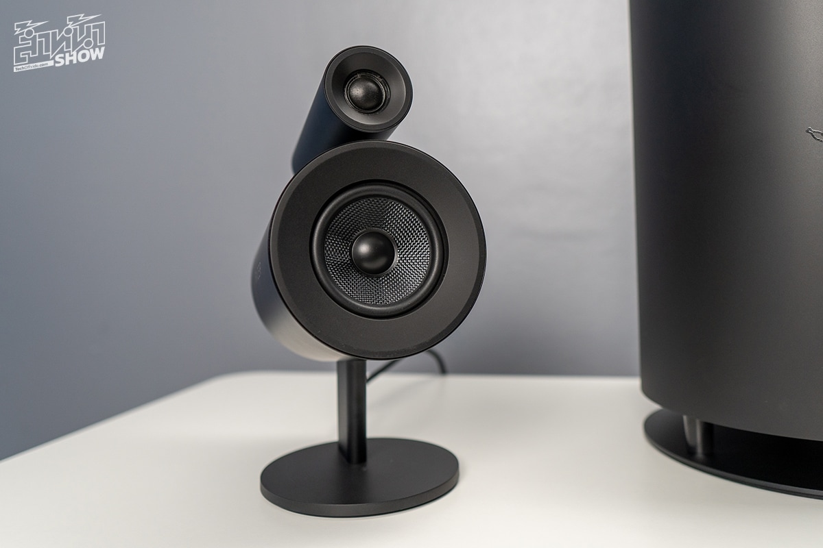 ตัวงานประกอบนั้นยกนิ้วให้ในเรื่องของความปราณีตและดูพรีเมียมดีมาก ในส่วนยูนิตลำโพงที่วางบนโต๊ะ ไดร์เวอร์จะแยกเป็น 2 ตัวตั้งซ้อนกัน ตั้งบนฐานตั้งที่แข็งแรงแน่นหนา โดยตัวไดร์เวอร์หลักจะมีขนาด 3 นิ้ว เคลือบด้วยไฟเบอร์ Kevlar ส่วนไดร์เวอร์ทวีตเตอร์เสียงสูง ขนาด 0.8 นิ้ว หุ้มด้วยวัสดุไหมทอ