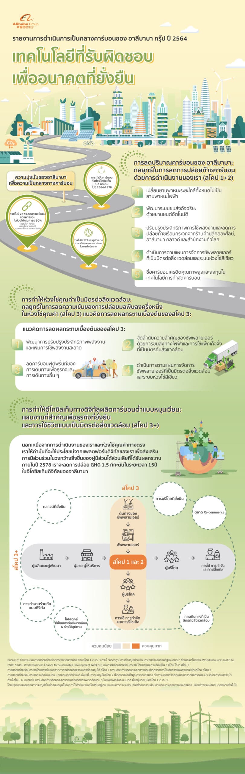 บริษัท อาลีบาบา กรุ๊ป โฮลดิ้ง จำกัด “อาลีบาบา” หรือ “อาลีบาบา กรุ๊ป” ประกาศคำปฏิญาณที่จะบรรลุความเป็นกลางทางคาร์บอนภายใต้การดำเนินงานของบริษัทเองภายในปี 2573 และประกาศเป้าหมาย สโคป 3+ ซึ่งเป็นโครงการริเริ่มที่มีเป้าหมายเพื่อลดการปล่อยก๊าซคาร์บอนไดออกไซด์ 1.5 กิกะตันทั่วทั้งอีโคซิสเท็มของอาลีบาบาภายในปี 2578 รายละเอียดเกี่ยวกับเป้าหมายดังกล่าว รวมถึงแนวคิดและคำจำกัดความของแนวคิด สโคป 3+ ที่เพิ่งเปิดตัวไปนั้น จะอยู่ใน รายงานการดำเนินการความเป็นกลางทางคาร์บอนของอาลีบาบา อาลีบาบา มีเป้าหมายที่จะเผยแพร่ข้อมูลที่อัปเดตทุกปี ซึ่งจะมีการตรวจสอบความคืบหน้าจากผู้ตรวจสอบที่ได้รับการรับรอง