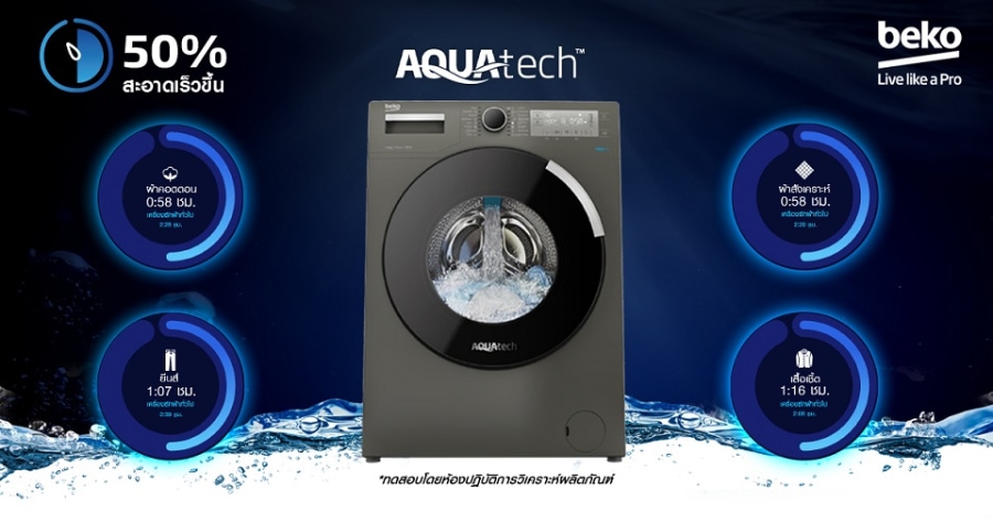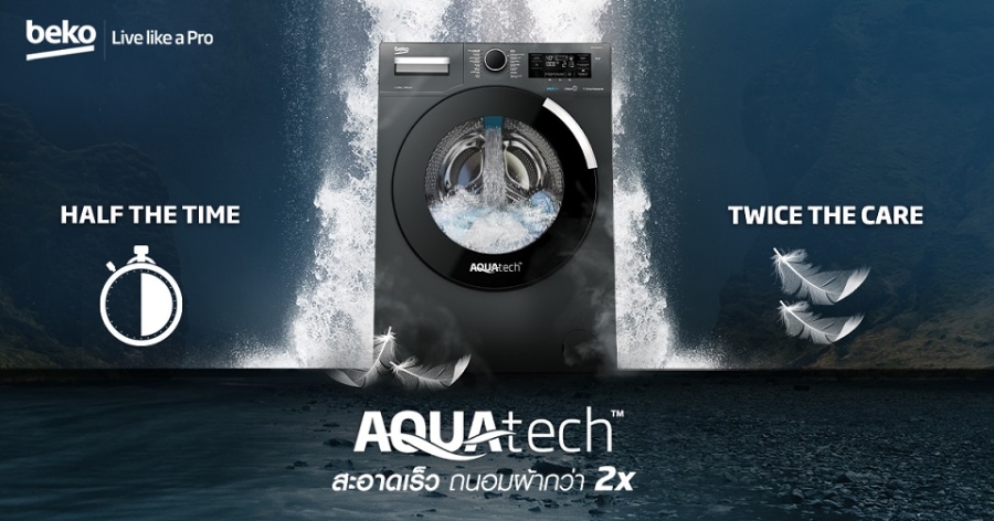Beko เข้าใจถึงปัญหาที่เหล่าคนรักเสื้อผ้าต้องเผชิญ โดยเฉพาะกลุ่มคนที่อาศัยอยู่ในเมืองที่มีวิถีชีวิตที่เร่งรีบ บางครั้งการใช้โปรแกรมซักเร็ว อาจไม่ตอบโจทย์ในเรื่องของการถนอมผ้า เนื่องจากผ้าแต่ละชนิดต้องการการดูแลที่แตกต่างกัน การใช้โปรแกรมซักเร็วเพียงอย่างเดียว อาจทำให้เสื้อผ้าตัวโปรดเกิดความเสียหายได้ Beko จึงได้คิดค้นและพัฒนานวัตกรรมพลังซักที่อ่อนโยนในเครื่องซักผ้าฝาหน้ารุ่นใหม่ Beko AquaTech เพื่อแก้ไขปัญหาเหล่านี้ ซึ่งนวัตกรรมพลังซักที่อ่อนโยนในเครื่องซักผ้าฝาหน้า AquaTech ได้รับแรงบันดาลใจในการพัฒนาขึ้นจากพลังกระแสน้ำตกธรรมชาติ โดยใช้หลักการตกกระทบของกระแสน้ำช่วยให้ซักผ้าสะอาดเร็วขึ้นถึง 50% แต่ยังคงประสิทธิภาพความสะอาด และยังช่วยทดแทนการปั่นผ้าที่รุนแรงของถังซัก ทำให้ถนอมผ้ามากขึ้นถึง 50% และด้วยจุดเด่นเหล่านี้ ทำให้เครื่องซักผ้าฝาหน้า AquaTech™ กลายเป็นผู้ช่วยมือโปรที่ตอบโจทย์การดูแลเสื้อผ้า เอาใจเหล่าแฟชั่นนิสต้าและคนรักเสื้อผ้าได้มากกว่าที่เคย