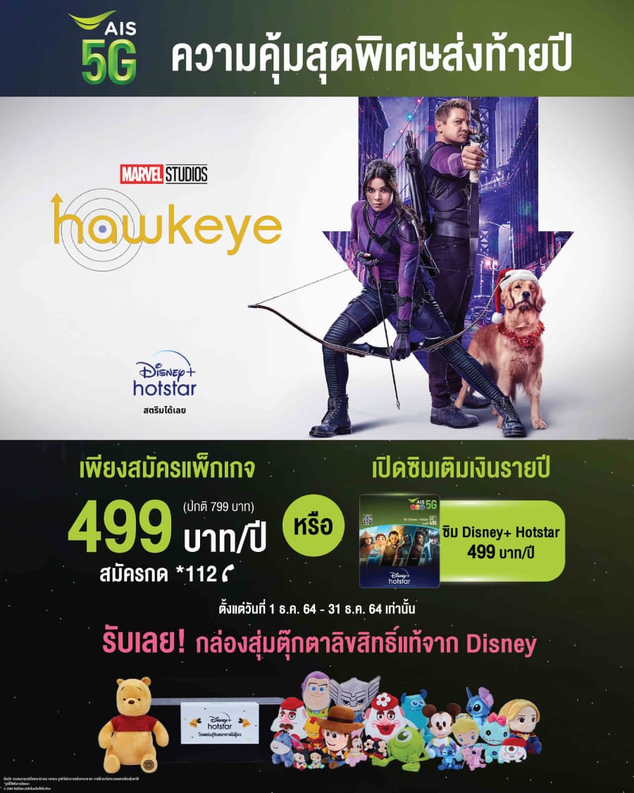 สำหรับผู้ที่สนใจร่วมแคมเปญรับกล่องสุ่มตุ๊กตาลิขสิทธิ์แท้จาก Disney อย่ารอช้าเพียงทำการสมัครแพ็กเกจหรือเปิดซิมเติมเงิน Disney+ Hotstar แบบรายปี รวมถึงผู้ที่สมัคร Disney+ Hotstar แบบรายเดือนที่ต้องการเปลี่ยนมาสมัครรายปี ในช่วงระหว่างวันที่ 1-31 ธันวาคมนี้เท่านั้น ถือเป็นช่วงเวลาสุดพิเศษที่ AIS และ Disney+ Hotstar จะขอส่งต่อความสุข สนุกสนานให้กับคุณ สามารถดูรายละเอียดเพิ่มเติมได้ที่ https://m.ais.co.th/6yHj60lH8
