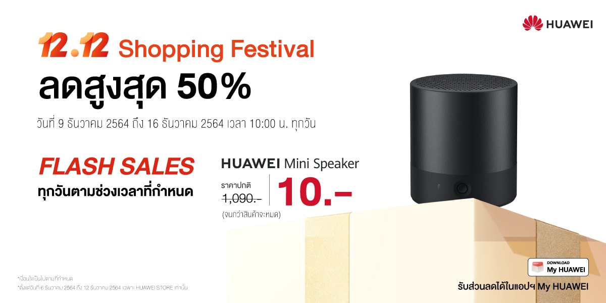 - ลำโพงบลูทูธ HUAWEI Mini Speaker ที่มีขนาดกะทัดรัด น้ำหนักเบา เหมาะกับการพกพา มอบประสบการณ์เสียงคมชัดและเสียงเบสที่นุ่มลึก ได้คุณภาพเสียงสเตอริโอแบบ 360 องศาที่ให้ความรู้สึกสมจริง ลดราคาเหลือเพียง 10 บาท! จากราคาปกติ 1,090 บาท เมื่อซื้อสินค้าในเว็บไซต์ HUAWEI Store ผ่านแอปพลิเคชัน My HUAWEI ในช่วง Flash Sale 10.00 น. ซึ่งจัดขึ้นทุกวันระหว่างวันที่ 9 ธันวาคม 2564 ถึง 16 ธันวาคม 2564 ใน HUAWEI Store เท่านั้น