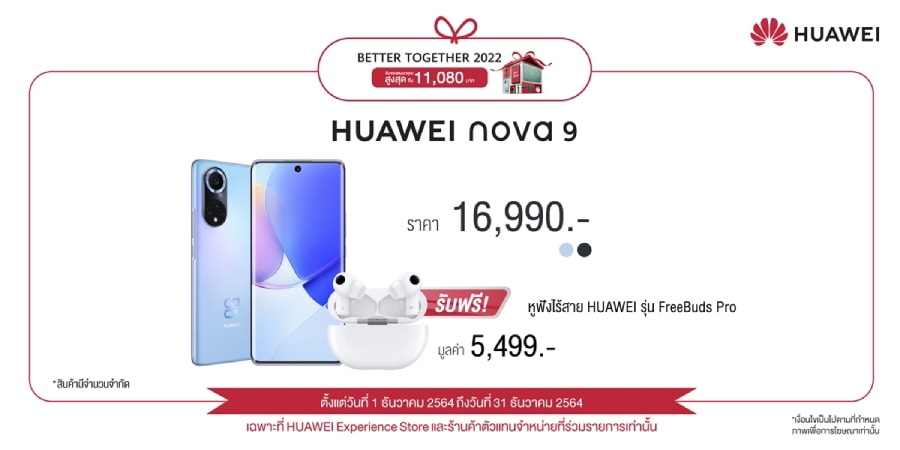 HUAWEI nova 9 วางจำหน่ายแล้วในราคา 16,990 บาท พร้อมโปรโมชันพิเศษรับปลายปี เมื่อซื้อสินค้าระหว่างวันที่ 1 ธันวาคม 2564 ถึง 31 ธันวาคม 2564 รับไปเลยหูฟังไร้สาย HUAWEI FreeBuds Pro มูลค่า 5,499 บาท ทางหน้าร้าน HUAWEI Experience Store ร้านค้าตัวแทนจำหน่ายที่ร่วมรายการทั่วประเทศ พร้อมทั้งทางเว็บไซต์ HUAWEI Store และร้านค้าอย่างเป็นทางการของหัวเว่ยใน Shopee, Lazada และ JD Central