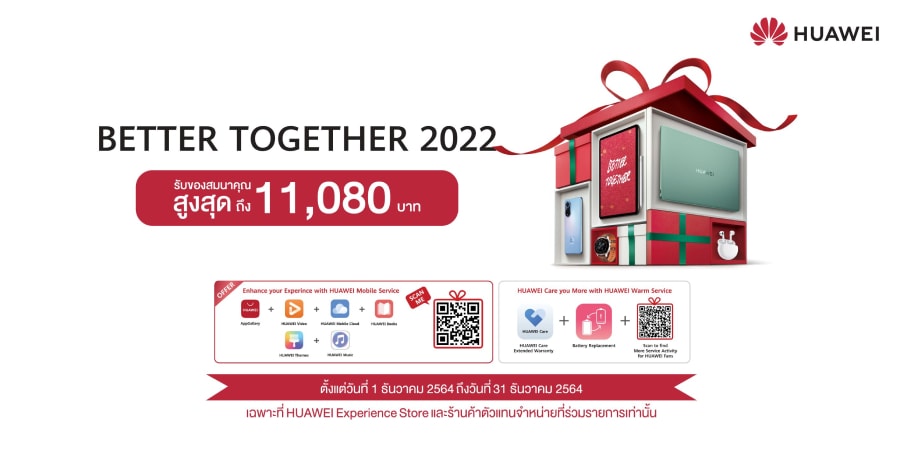 พร้อมกันนี้ หัวเว่ยยังมอบข้อเสนอสุดคุ้มเป็นของขวัญแทนคำขอบคุณให้กับลูกค้า กับแคมเปญโปรโมชัน Better Together 2022 จัดเต็มของสมนาคุณรวมมูลค่าสูงสุด 11,080 บาท พร้อมส่วนลดสุดพิเศษสำหรับผลิตภัณฑ์ชั้นนำอีกมากมาย สำหรับผู้ที่ซื้อสินค้าที่ร้าน HUAWEI Experience Store