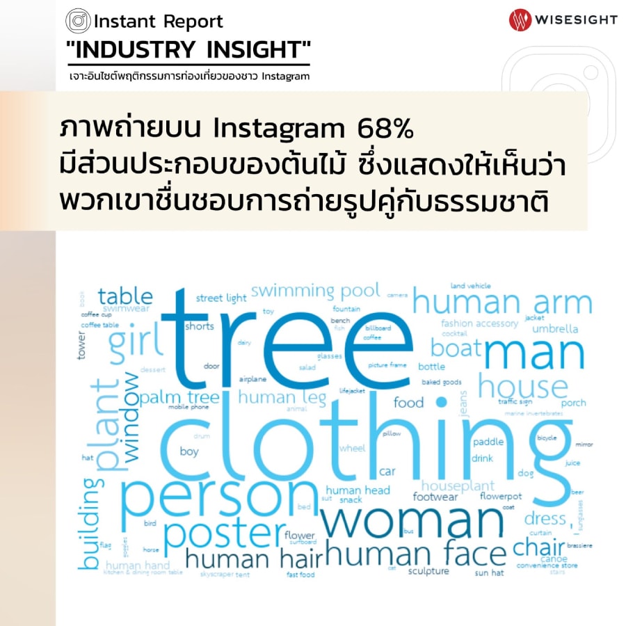 - จากการวิเคราะห์รูปภาพ 40,000 รูปที่ถูกโพสต์บน Instagram ตั้งแต่วันที่ 1 ตุลาคม – 15 พฤศจิกายน พบว่า 68% เป็นภาพถ่ายธรรมชาติมีส่วนประกอบของต้นไม้ และ 53% เป็นภาพถ่ายคน โดยภาพถ่ายธรรมชาติ สามารถแบ่งออกเป็น 3 กลุ่มใหญ่ คือ กลุ่มภาพวิวธรรมชาติ (38%)