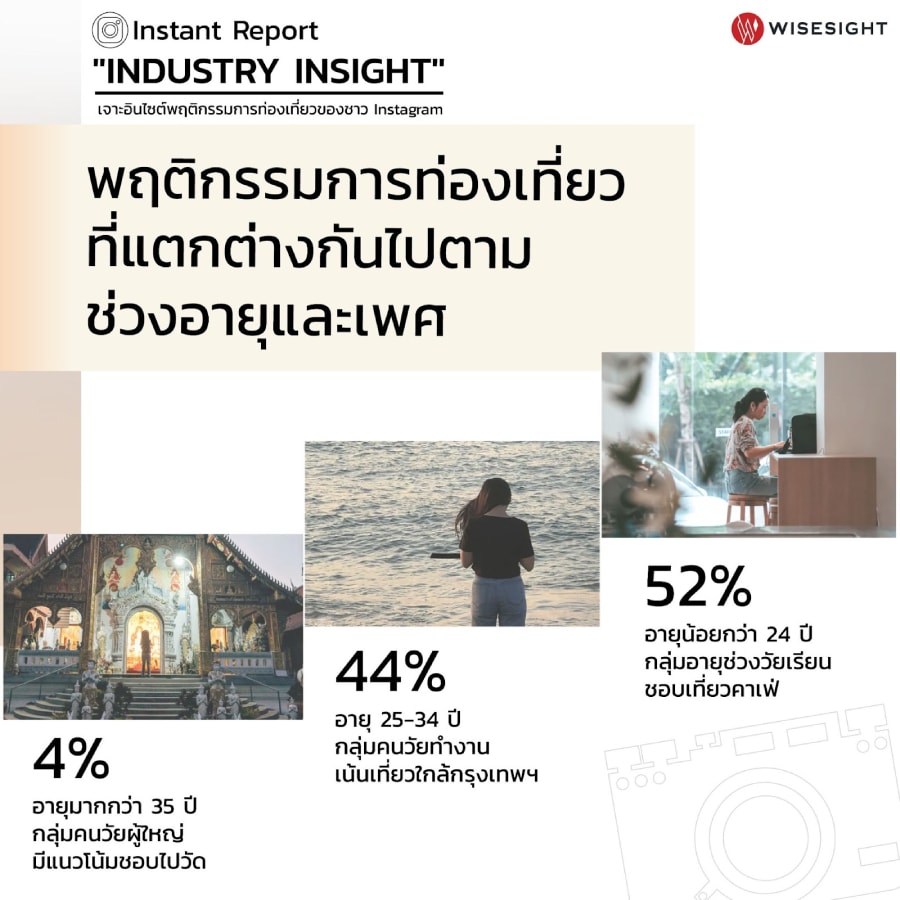- กลุ่มวัยเรียน ในช่วงอายุน้อยกว่า 24 ปี ถือเป็นกลุ่มใหญ่สุดในสายท่องเที่ยวบน Instagram พบว่ามักเดินทางท่องเที่ยวเน้นธรรมชาติ และคาเฟ่