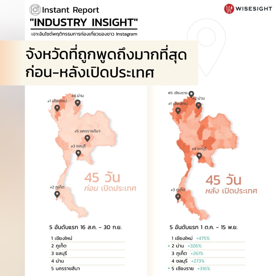- ในช่วงปิดประเทศ (16 สิงหาคม – 30 กันยายน 2564) ชาวโซเชียลพูดถึงจังหวัด เชียงใหม่ มากที่สุด ตามมาด้วยภูเก็ต, ชลบุรี, น่าน, นครราชสีมา และในช่วงเปิดประเทศ (1 ตุลาคม – 15 พฤศจิกายน 2564) ชาวโซเชียลยังคงพูดถึงจังหวัดเชียงใหม่มากที่สุด ตามมาด้วยน่าน, ภูเก็ต, ชลบุรี, เชียงราย จะเห็นว่าการท่องเที่ยวทางภาคเหนือได้รับความนิยมสูงสุดทั้งในช่วงปิด และเปิดประเทศ
