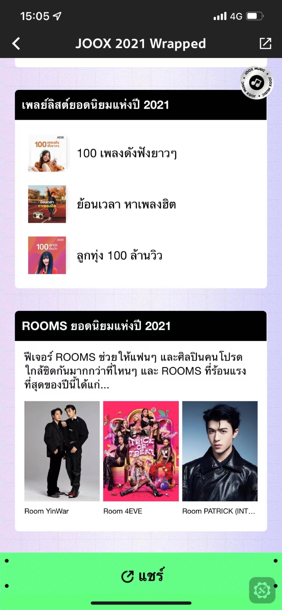 เมื่อโค้งสุดท้ายของปี 2021 กำลังจะมาถึง JOOX จึงขอโชว์สถิติที่น่าสนใจบนแพลตฟอร์ม กับ Music Annual Review 2021 ที่ดึงบิ๊กดาต้าพฤติกรรมผู้ใช้งานชาวไทย ทั้งการฟังเพลง การจอยและสร้างห้องต่างๆ ผ่านฟีเจอร์ JOOX ROOMS ชมไลฟ์อีเวนท์ต่างๆ รวมไปถึงเทรนด์และกระแสความฮิตเกี่ยวกับดนตรีของผู้ใช้งาน ไม่ว่าจะเป็นศิลปิน หรือเพลงที่ได้รับความนิยมสูงสุด หรือกระแสความฮิตของฟีเจอร์ใหม่อย่าง JOOX ROOMS พร้อมส่ง JOOX Wrapped 2021 ให้ผู้ใช้งานได้สนุกกับการดูสถิติการฟังเพลงของตัวเอง