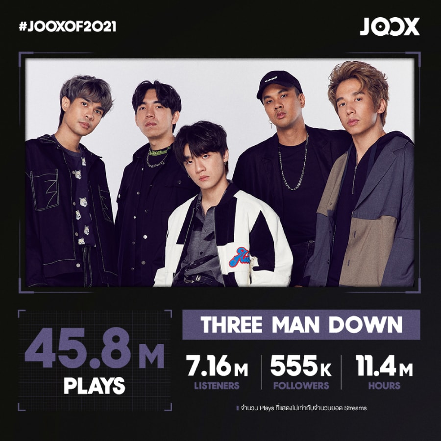 จากพฤติกรรมการฟังเพลงของผู้ใช้งานชาวไทย พบว่าศิลปินที่ครองใจแฟนเพลงชาวไทยมากที่สุดแห่งปี 2021 ยังคงเป็น THREE MAN DOWN เจ้าของเพลงฮิตมากมาย อย่าง วันเกิดฉันปีนี้, ฝนตกไหม และฝันถึงแฟนเก่า ด้วยการยืนหนึ่งศิลปินที่มีสถิติการฟังเพลงมากที่สุดเป็นปีที่ 2 โดยตลอดปีนี้มียอดการฟังเพลงสูงกว่าถึง 45.8 ล้านครั้ง ซึ่งเพลง ‘ถ้าเธอรักฉันจริง’ เป็นซิงเกิลที่คว้าอันดับ 5 เพลงฮิตแห่งปีไปครองอีกด้วย