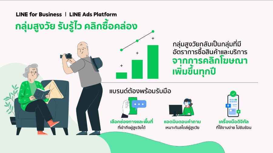 กลุ่มช่วงอายุของผู้บริโภคที่มีการคลิกโฆษณาบนแพลตฟอร์ม LINE มากที่สุดในปี 2021 คือ กลุ่มสูงวัย (Baby Boomer) และกลุ่มเด็กอายุ 15-19 ปี (Gen Z) ซึ่งแม้กลุ่มสูงวัยจะมีปฏิสัมพันธ์หรือ Engagement กับโฆษณาน้อยลงในแต่ละปี ด้วยอัตราเติบโตของการคลิกลดลงในช่วง 3 ปีที่ผ่านมา ซึ่งตรงกันข้ามกับกลุ่มเด็กที่มีอัตราการคลิกเติบโตขึ้นมาโดยตลอด แต่กลุ่มสูงวัยกลับเป็นกลุ่มที่มีอัตราการซื้อสินค้าและบริการจากการคลิกโฆษณาเพิ่มขึ้นทุกปี และสูงที่สุดในปีนี้ เมื่อเทียบกับกลุ่มเด็กที่อาจจะยังไม่มีกำลังซื้อ ชี้ให้เห็นว่า กลุ่มผู้บริโภคสูงวัยเริ่มคุ้นเคยกับโลกออนไลน์มากขึ้น จนมีการเลือกคลิกโฆษณาที่พวกเขาสนใจจริงๆ และจะตัดสินใจซื้อสินค้ากับแบรนด์ที่ตอบโจทย์เท่านั้น