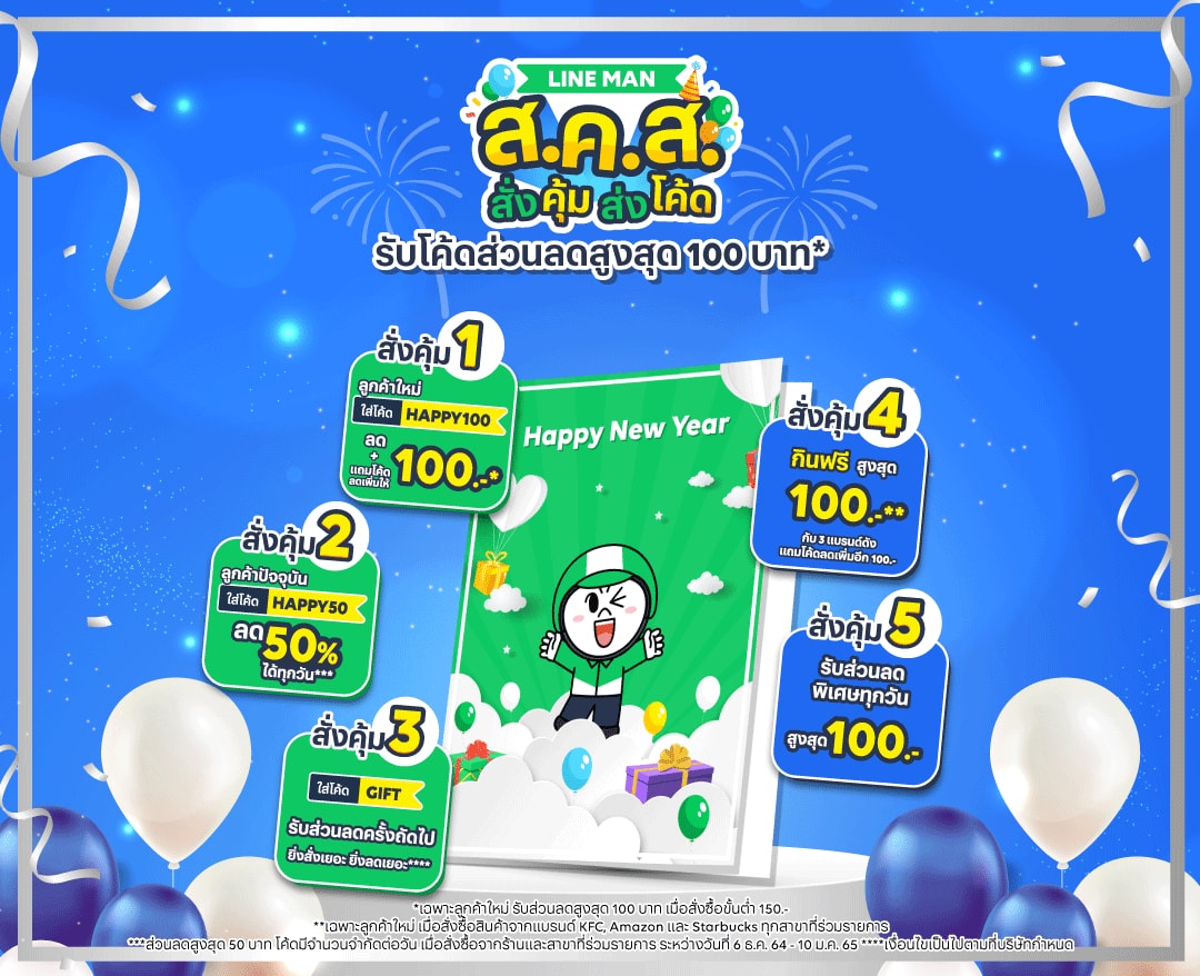LINE MAN เปิดมหกรรมแคมเปญแห่งความคุ้มส่งท้ายปี “LINE MAN ส.ค.ส. สั่งคุ้ม ส่งโค้ด” ส่งความสุข ยุคนิวนอร์มอล มอบความคุ้มแห่งปีได้ถึง 5 คุ้ม สำหรับทุกมื้อพิเศษ แค่เปิดแอป LINE MAN ทุกวัน ก็ได้โค้ดส่วนลดทุกวัน ฉลองเทศกาลส่งท้ายปีเก่าต้อนรับปีใหม่ด้วยโปรคุ้มๆ กับอาหารโปรดจากร้านดังครอบคลุมทั่วประเทศมากที่สุดกว่า 500,000 ร้าน แจกโค้ด ไม่อั้น อิ่มฟรีทุกวันสูงสุด 100 บาท ตั้งแต่วันนี้ – 10 มกราคม 2565
