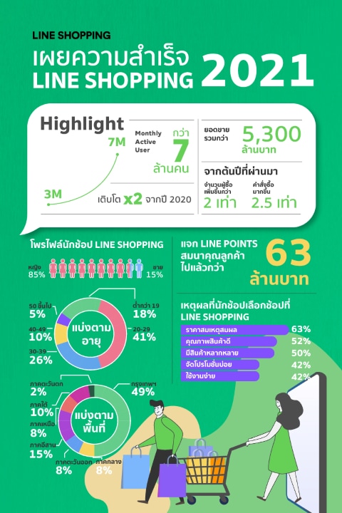 อาทิ แคมเปญ Pay Day สุขคูณสาม ที่จัดขึ้นทุกสิ้นเดือนให้ลูกค้าได้รับพ้อยท์สูงพิเศษถึง 3 เท่า หรือ แคมเปญ LINE POINTS BACK ที่มอบพ้อยท์สูงสุด 100 พ้อทย์ต่อออเดอร์ ซึ่งมีส่วนช่วยดันยอดขายโดยรวมทั้งแพลตฟอร์มสูงขึ้นกว่า 50% เพิ่มยอดใช้จ่ายต่อครั้งเฉลี่ย 1,800 บาท และ เพิ่มความถี่การซื้อมากขึ้น 12% โดยในปีที่ผ่านมาลูกค้าได้รับแต้มสะสม LINE POINTS จาก LINE SHOPPING ไปแล้ว ถึง 63 ล้านพ้อยท์ เท่ากับมูลค่า 63 ล้านบาท”