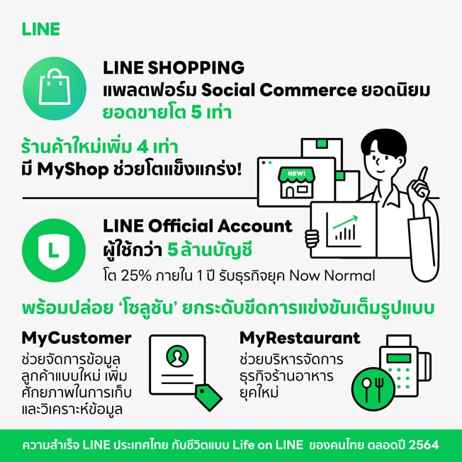 LINE Official Account ยังคงครองตำแหน่งช่องทางยอดนิยมของธุรกิจไทยในการนำเสนอสินค้าและบริการ พร้อมการพูดคุยและปิดการขาย ด้วยยอดการใช้งานที่เพิ่มขึ้นเป็น 5 ล้านบัญชี (ณ เดือน ส.ค. 2564) เป็นการเติบโตถึง 25% ภายใน 1 ปี ครองใจผู้ประกอบการทุกขนาดทั้งองค์กรใหญ่, MSMEs รวมไปถึงแบรนด์แฟชันลักชัวรี ด้วยการเป็นช่องท่างที่ช่วยให้เข้าถึงกลุ่มลูกค้าอย่างถึงลูกถึงคน