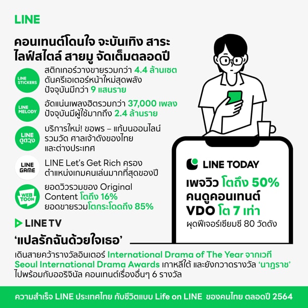 ขณะที่ฟาก LINE TODAY ที่กลายเป็นแพลตฟอร์มคอนเทนต์ที่มากกว่าแค่สาระ ให้ตามทันทุกเทรนด์ก็มียอดเพจวิวโตถึง 50% จากปีก่อน เจาะกลุ่มคนรุ่นใหม่ด้วยสารพันคอนเทนต์ไลฟ์สไตล์หลากหลาย คอนเทนต์วิดีโอสั้นมาแรงที่มีผู้ชมเพิ่มถึง 7 เท่า และไม่ลืมที่จะเอาใจสายมูด้วยฟีเจอร์เซียมซีจาก 80 วัดดัง แล้วไปมูกันต่อยาวๆ กับ LINE DOODUANG บริการใหม่ที่ออกมาเพื่อเสริมประสบการณ์ขอพร – แก้บนออนไลน์ได้โดยไม่ต้องออกจากบ้าน