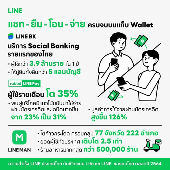 จากความสามารถในการตอบโจทย์และความต้องการการใช้งานในแบบ แชท-ยืม-โอน–จ่าย ที่ทำให้บริการด้าน Fintech ของแอปฯ LINE สมบูรณ์และโดดเด่นสำหรับผู้ใช้ในเมืองไทย เห็นได้จากการเติบโตของบริการด้านการเงิน อย่าง LINE BK บริการ social banking รายแรกของไทย ตลอดหนึ่งปีที่ผ่านมา LINE BK มีผู้ใช้บริการกว่า 3.9 ล้านราย มีการเปิดใช้งานบัญชีเงินฝาก 4.5 ล้านบัญชี บัตรเดบิต 2 ล้านบัตร ส่วนใหญ่เป็นบัตรประเภทออนไลน์ ซึ่งสอดคล้องกับพฤติกรรมช้อปปิงออนไลน์ที่สูงขึ้น ขณะที่ด้านบริการให้กู้ยืมนั้นมีวงเงินให้ยืมทั้งสิ้นกว่า 5 แสนบัญชี เพิ่มโอกาสการเข้าถึงแหล่งเงินทุนที่เชื่อถือได้สำหรับเหล่าฟรีแลนซ์และผู้ที่ไม่มีรายได้ประจำ