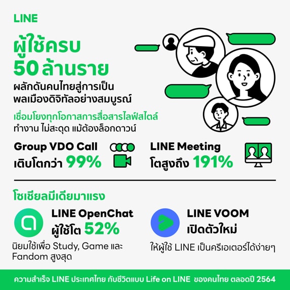 ปี 2564 เป็นปีที่ LINE ครบรอบ 10 ปี สามารถพิชิตยอดผู้ใช้งานถึง 50 ล้านคน นับเป็นจุดเริ่มต้นของการเป็นพลเมืองดิจิทัลของคนไทยมากกว่า 2 ใน 3 ของจำนวนประชากรไทยทั้งหมด LINE ยังคงทำหน้าที่ช่วยเชื่อมผู้คนผ่านฟีเจอร์สื่อสารต่าง ๆ ให้ได้ใกล้กันอย่างต่อเนื่อง เช่นเดียวกันกับในสถานการณ์ล็อกดาวน์ที่การสื่อสารของคนไทยไม่สะดุดแม้ต้องรักษาระยะห่าง เห็นได้จาก LINE Group VDO Call ที่ทะยานสูงถึง 99% (ระหว่างม.ค. – ต.ค. เทียบกับช่วงเดียวกันของปีก่อนหน้า) ในขณะเดียวกัน LINE Meeting ก็เติบโตสูงขึ้นถึง 191% (นับตั้งแต่ช่วงเปิดตัวเมื่อ ส.ค. 2563) สะท้อนให้เห็นว่าคนไทยนั้นนอกจากจะใช้ LINE สื่อสารในชีวิตประจำวันแล้ว ยังใช้ในการทำธุรกิจและการทำงานช่วง Work From Home อีกด้วย