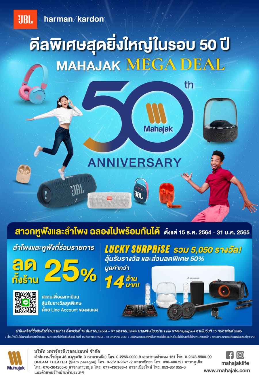 บริษัท มหาจักรดีเวลอปเมนท์ จำกัด จัดแคมเปญพิเศษฉลอง 50th Anniversary สินค้า Lifestyle Audio ทั้งหูฟัง และลำโพง JBL และ Harman Kardon ลดราคาทั้งร้าน 25% (เฉพาะรุ่นที่ร่วมรายการ) พิเศษ!!รับสิทธิ์ลุ้นรับรางวัล 5,050 รางวัล และส่วนลดพิเศษ 50% มูลค่ารวมกว่า 14 ล้านบาท