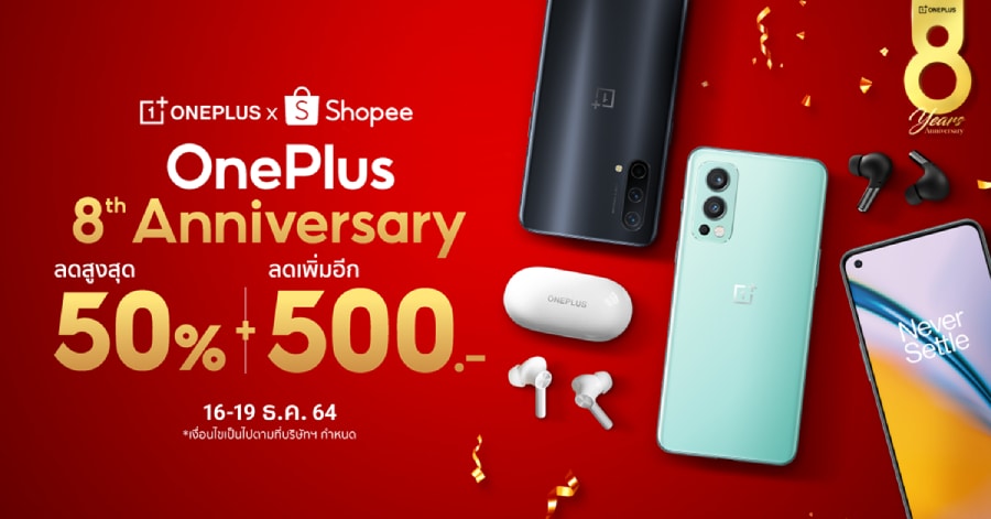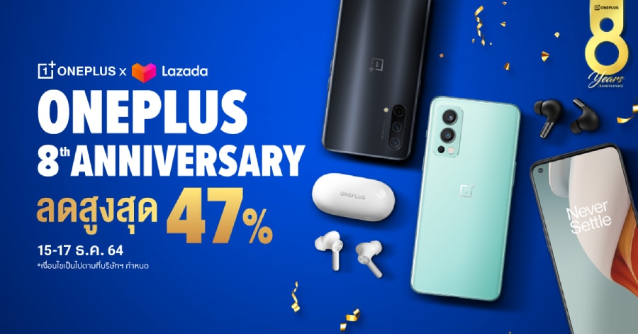OnePlus ฉลองครบรอบ 8 ปี OnePlus Birthday Sale ยกทัพสมาร์ทโฟนและอุปกรณ์มือถือ มาลดราคากระหน่ำสูงสุด 50% พร้อมคูปองส่วนลดเพิ่มอีก 500 บาท จัดจำหน่ายสามช่องทางออนไลน์ Shopee, Lazada และ JD Central เตรียมตัวให้พร้อม แล้วรอไปช้อปกันเลยวันที่ 16 – 20 ธ.ค. 64 นี้เท่านั้น!