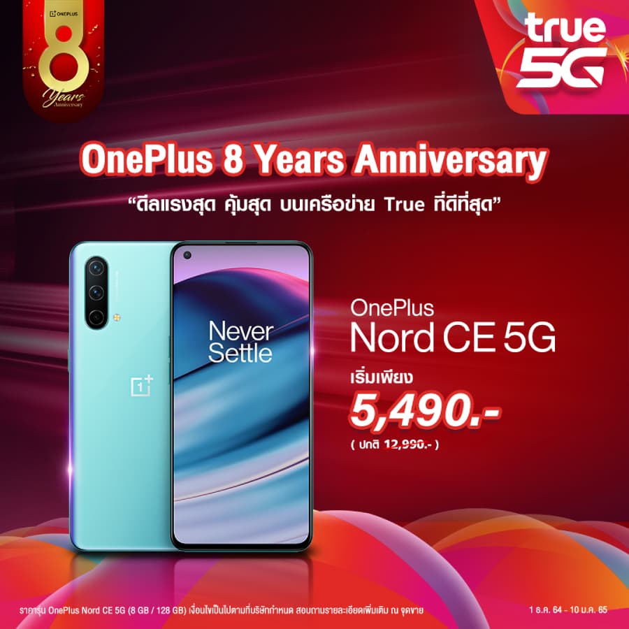 และ ทรูมูฟ เอช เมื่อซื้อ OnePlus Nord CE 5G พร้อมแพ็กเกจรายเดือน ในราคาเริ่มต้นเพียง 5,490 บาท ได้ตั้งแต่วันนี้ – 10 มกราคม 2565 สอบถามรายละเอียดโปรโมชั่นเพิ่มเติมได้ ณ จุดขาย