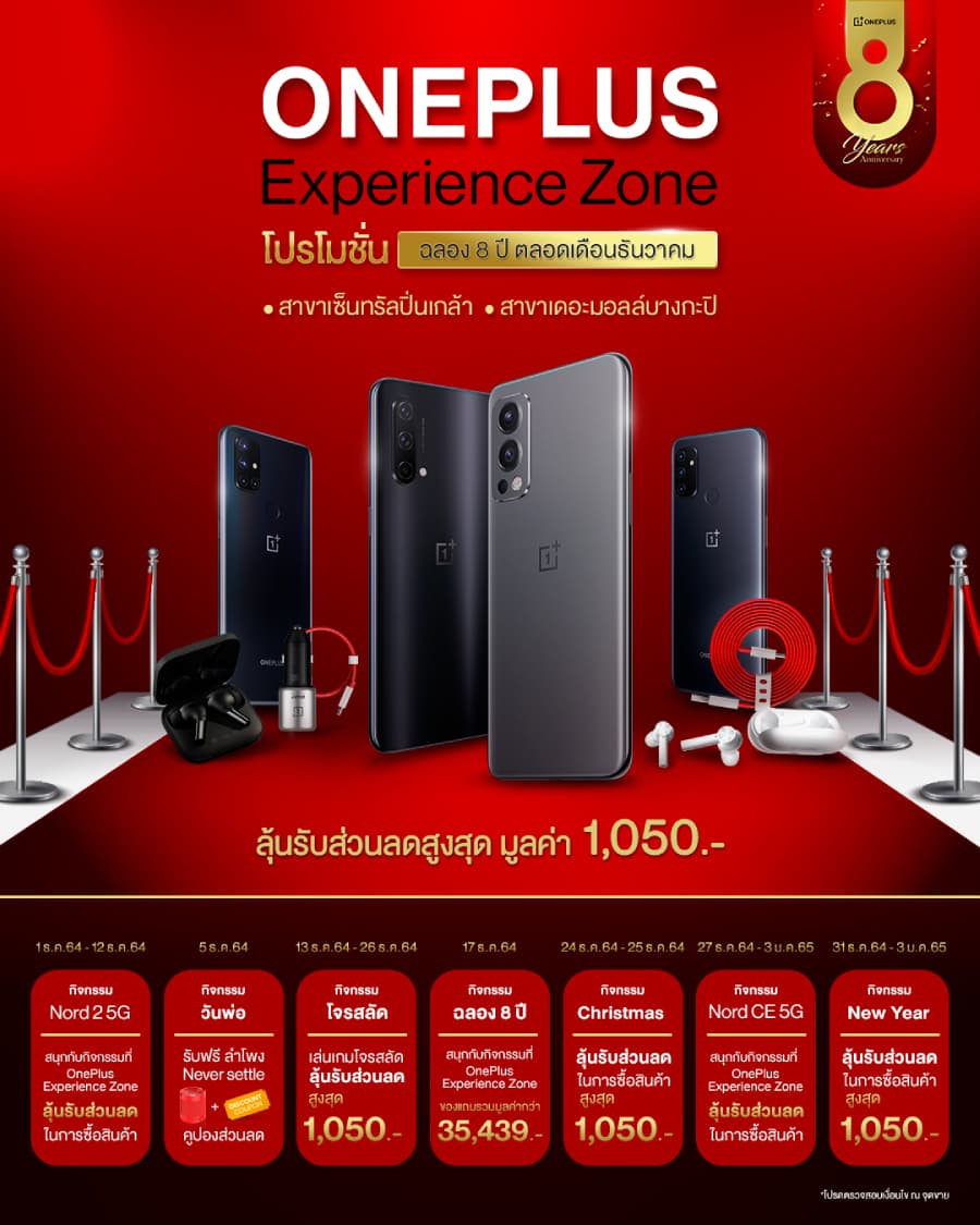 เซอร์ไพรส์จาก OnePlus Experience Zone พบกับโปรโมชั่นสมาร์ตโฟนรุ่นดังและกิจกรรมให้ร่วมสนุก ทั้ง OnePlus Nord N10 5G, OnePlus Nord N100, OnePlus Nord CE 5G, OnePlus Nord 2 5G และอุปกรณ์เสริมมากมายที่ OnePlus Experience Zone ทั้ง 2 สาขา สาขาเซ็นทรัลปิ่นเกล้าและสาขาเดอะมอลล์บางกะปิ ลุ้นรับส่วนลดสูงสุด 1,050 บาท ตั้งแต่วันนี้ – 3 มกราคม 2565