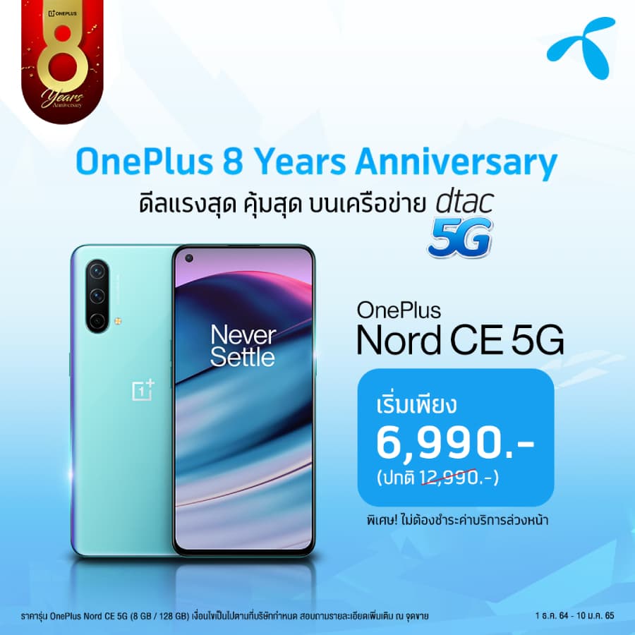 ต่อด้วยข้อเสนอสุดพิเศษจากดีแทค เมื่อซื้อ OnePlus Nord CE 5G ในราคาเริ่มต้นเพียง 6,990 บาท พร้อมแพ็กเกจรายเดือน ที่ศูนย์บริการดีแทคที่ร่วมรายการ ตั้งแต่วันนี้ – 10 มกราคม 2565
