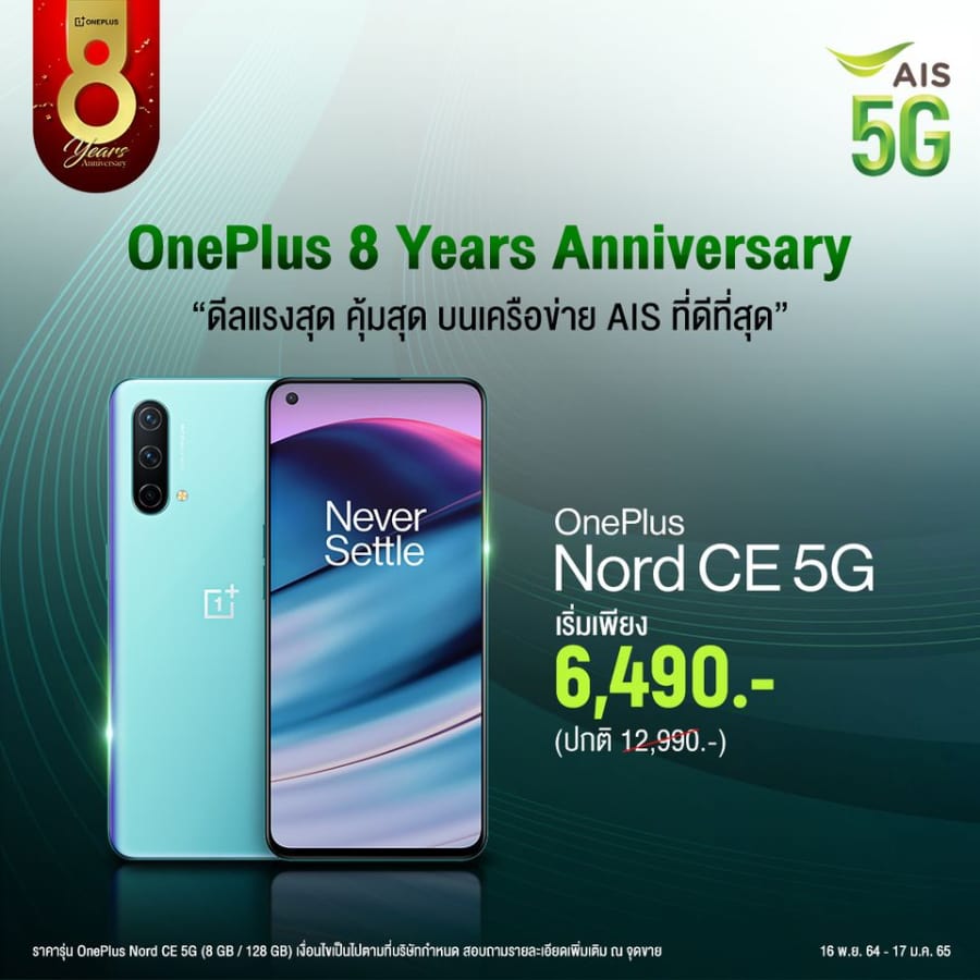 เริ่มกันที่ เอไอเอส เมื่อซื้อ OnePlus Nord CE 5G พร้อมแพ็กเกจรายเดือน ราคาเครื่องเริ่มต้นเหลือเพียง 6,490 บาท ตั้งแต่วันนี้ – 17 มกราคม 2565