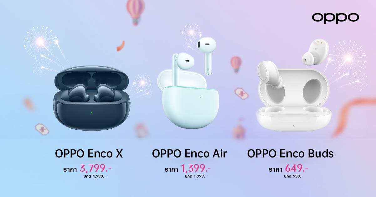 - OPPO Enco Air หูฟังไร้สายอัจฉริยะภายใต้สโลแกน “Sound You Can See” โดดเด่นด้วยดีไซน์แบบกึ่งโปร่งแสง พร้อมใช้งานได้อย่างยาวนานถึง 24 ชั่วโมง พิเศษ ราคา 1,399 บาท จากปกติ 1,999 บาท