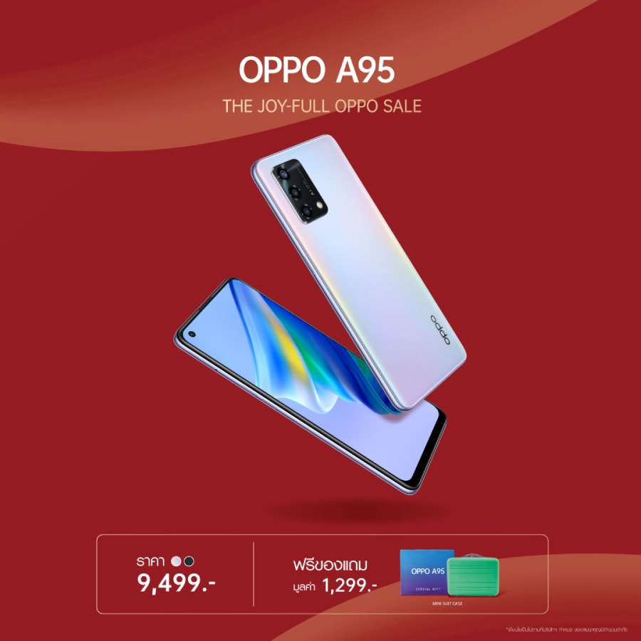 OPPO A95 สมาร์ทโฟนรุ่นใหม่ล่าสุด มาภายใต้สโลแกน “สมาร์ทไปให้สุดฟอร์ม” เอาใจสายเอนเตอร์เทรนเมนต์ ครอบคลุมทุกไลฟ์สไตล์ โดดเด่นด้วยดีไซน์บางเบาสุดสมาร์ท พร้อมฝาหลังที่สร้างด้วยเทคนิค OPPO Glow Design รุ่นแรกใน OPPO A Series มอบฝาหลังแบบด้านที่มีประกายระยิบระยับสวยงาม นอกจากนี้ ยังมอบความเร็วแรงที่มากกว่าด้วยRAM 8GB, ROM 128GB และ RAM Expansion ที่สามารถเพิ่มได้ถึง 5GB พร้อมชาร์จไว 33W Flash Charge และแบตเตอรี่ขนาดใหญ่จุใจ 5,000 mAh มอบความสนุกแบบไม่มีสะดุด รวมถึงมีดีไซน์บางเบา สวยโดดเด่น พร้อมด้วยหน้าจอ AMOLED FHD+ punch-hole display ขนาด 6.43 นิ้ว และฟีเจอร์ All-Day Eye Care ถนอมสายตา โดยเมื่อซื้อ OPPO A95 ในราคา 9,499 บาท รับฟรีทันที! กระเป๋า Mini suit case มูลค่า 1,299 บาท*