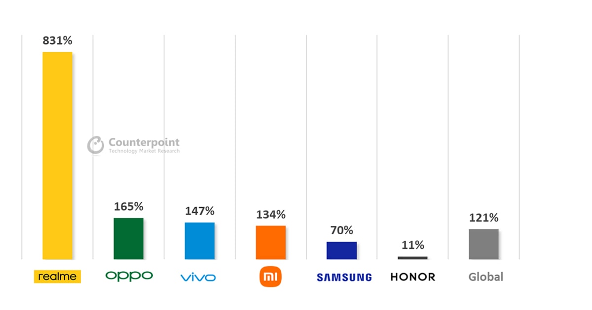 โดยแบรนด์ realme สามารถเติบโตเร็วกว่าตลาดด้วยยอดขายสมาร์ทโฟน 5G ที่โตไวถึง 831% เมื่อเทียบกับปีที่ผ่านมา เมื่อเทียบยอดขายสมาร์ทโฟนทั่วโลกแล้ว realme อัตราการเติบโตที่ 121% เมื่อเทียบกับปีที่ผ่านมา