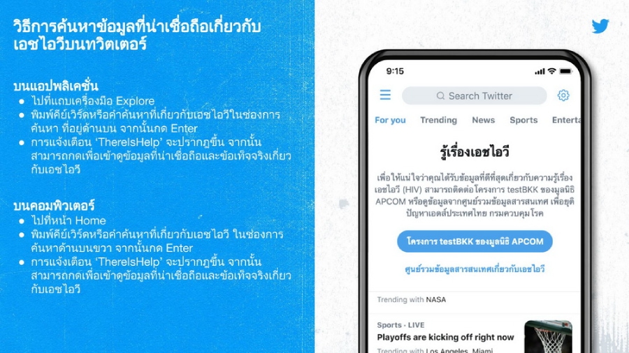 Twitter ประกาศเปิดตัวบริการแจ้งเตือน ThereIsHelp ซึ่งเป็นอีกหนึ่งในการให้บริการทั่วโลก ให้ข้อมูล HIV เนื่องในวันเอดส์โลก