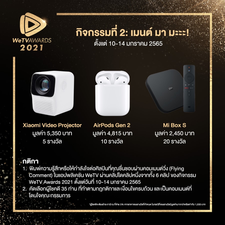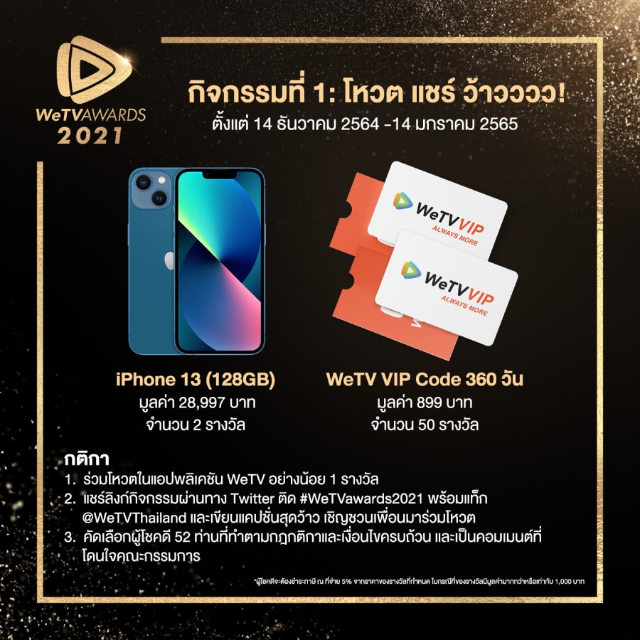 - รางวัลสำหรับผู้โชคดีที่เข้าร่วมโหวตอย่างน้อย 1 รางวัล และแชร์ลิงก์กิจกรรมผ่านทาง Twitter หรือ Facebook ติดแฮชแท็ก #WeTVawards2021 พร้อมแท็ก @WeTVThailand และเขียนแคปชันสุดว้าว เชิญชวนเพื่อนมาร่วมโหวตทาง WeTV จะทำการคัดเลือกผู้โชคดีจำนวน 52 ท่าน ที่ทำตามกฎ กติกา และเงื่อนไขครบถ้วนและเป็นคอมเมนต์ที่โดนใจคณะกรรมการ