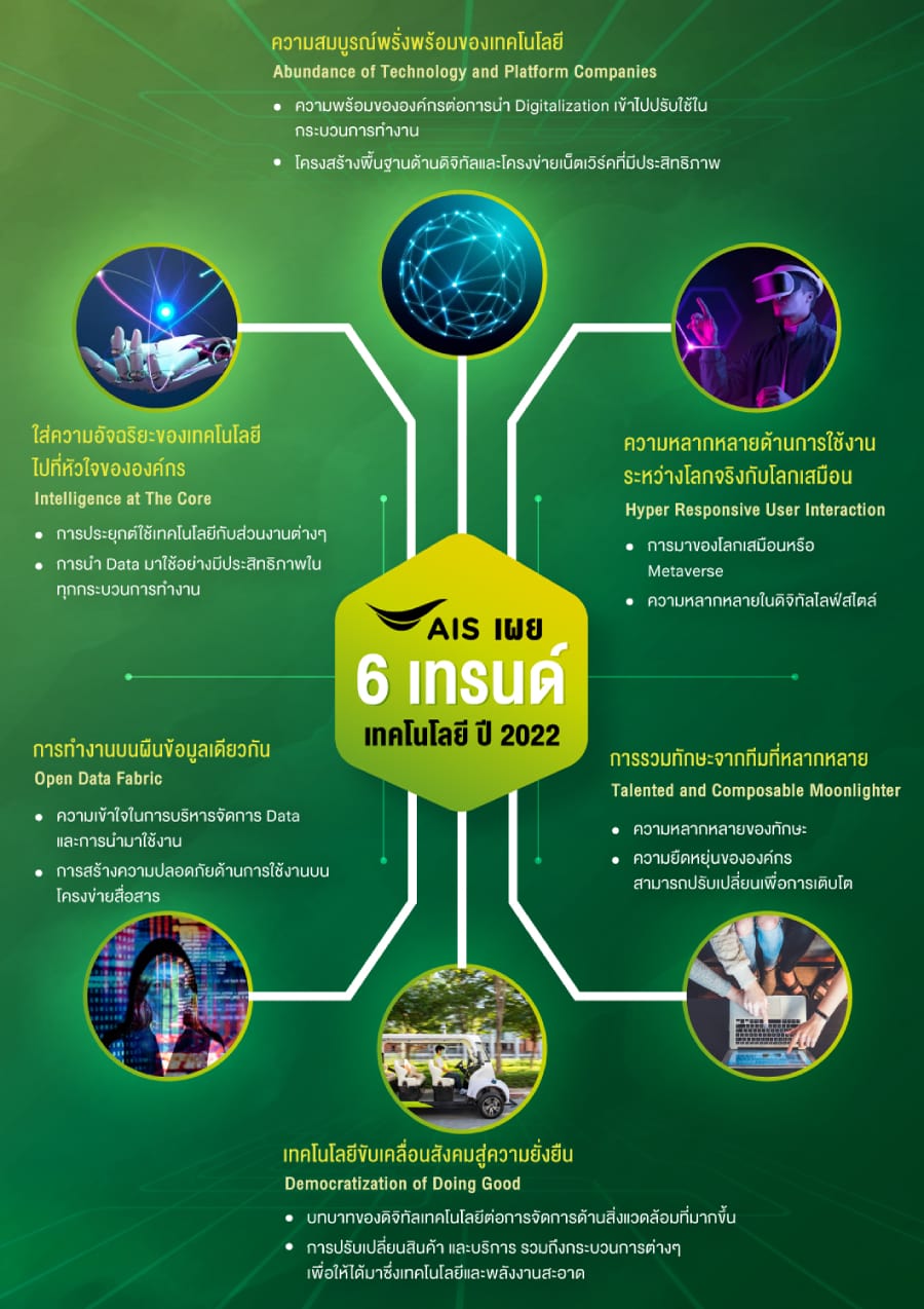 AIS ฉายภาพ เทรนด์เทคโนโลยี 2022 ชี้ “ดิจิทัล” คือเครื่องยนต์อัจฉริยะของการขับเคลื่อนโลกอนาคต ครอบคลุมทุกมิติ ที่จะสร้างการเปลี่ยนแปลงทั้งภาคธุรกิจ พฤติกรรมผู้บริโภค และสิ่งแวดล้อม