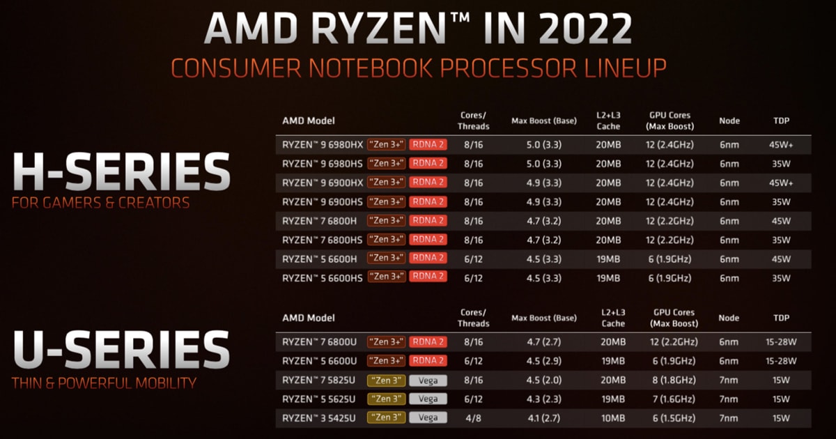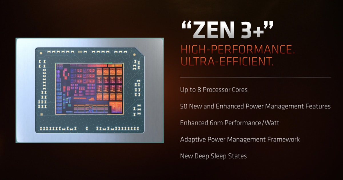 การเปิดตัวโปรเซสเซอร์ Ryzen 6000 Series ของ AMD เพื่อตอกย้ำความมุ่งมั่นที่จะเป็นผู้นำด้านผลิตภัณฑ์กลุ่มโน้ตบุ๊ก โดยโปรเซสเซอร์ดังกล่าวผลิตขึ้นบนสถาปัตยกรรมประสิทธิภาพสูง “Zen 3+” บนกระบวนการผลิต 6 นาโนเมตร รวมไปถึงการบูรณาการด้านกราฟิกที่ใช้สถาปัตยกรรม RDNA2 เพื่อมอบประสบการณ์การประมวลผลบนโมบายโปรเซสเซอร์ Ryzen ที่เร็วที่สุด