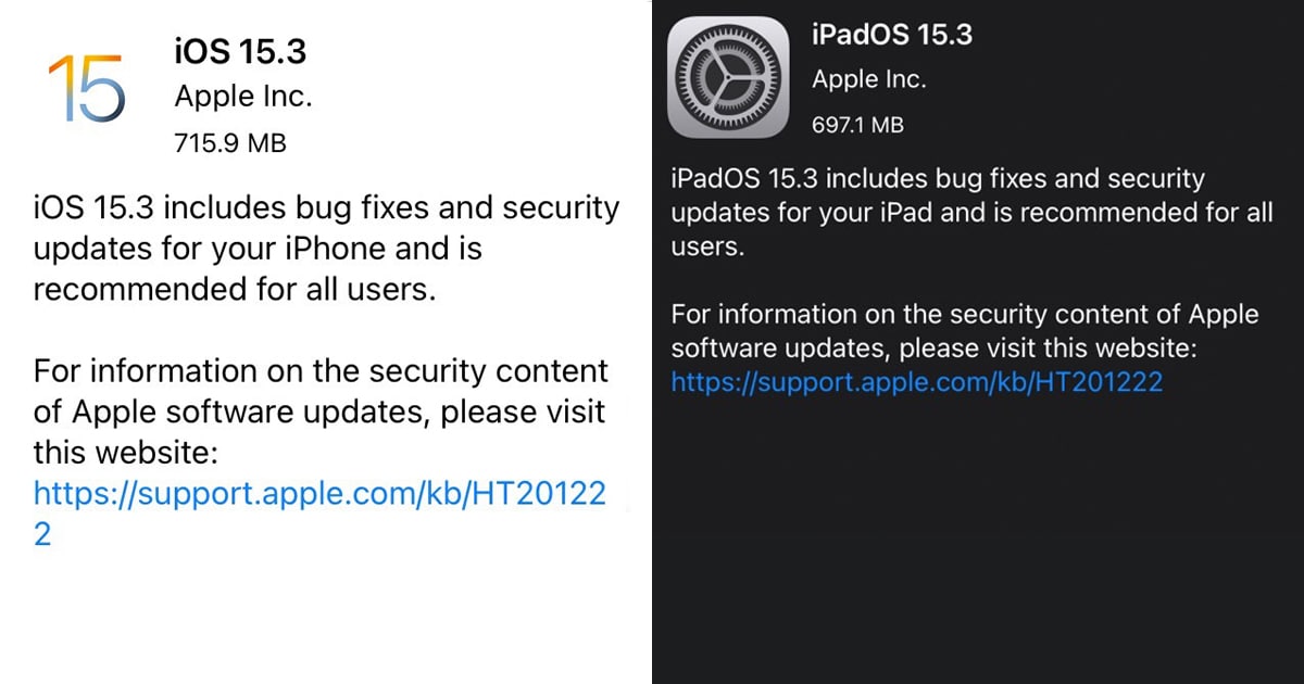 Apple ปล่อย iOS 15.3 และ iPadOS 15.3 ซึ่งเป็นการอัปเดตระบบปฏิบัติการหลักลำดับที่ 3 ของ iOS และ iPadOS 15 ที่เปิดตัวไปเมื่อเดือนกันยายน 2021 โดยการอัปเดตครั้งนี้เป็นการอัปเดตการแก้ไขพวกบั๊กต่างๆ เล็กน้อย