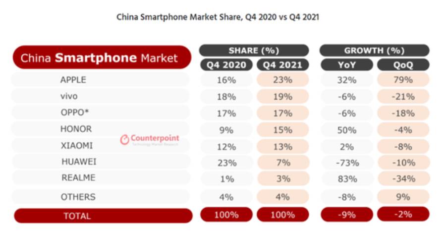 ถึงแม้แบรนด์ใหญ่ ๆ อย่าง Apple, Honor และ Realme จะมีการเติบโตเพิ่มขึ้นในไตรมาสที่ 4 ปี 2021 แต่ตลาดสมาร์ทโฟนจีนโดยรวมกลับมียอดเติบโตลดลงถึง 9% และก่อนหน้านี้ vivo ถือครองส่วนแบ่งตลาดกว่า 22% ตลอดปี 2021 จนกระทั่งมาแพ้ให้กับแอปเปิ้ลในไตรมาสที่ 4 นั่นเอง