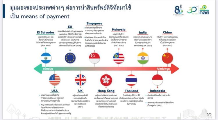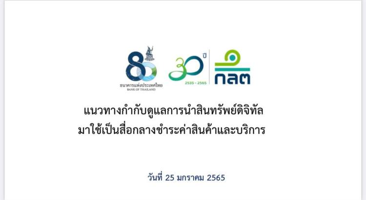 ธนาคารแห่งประเทศไทย (ธปท.) สำนักงานคณะกรรมการกำกับหลักทรัพย์และตลาดหลักทรัพย์ (ก.ล.ต.) และกระทรวงการคลัง (กค.) ได้หารือร่วมกันถึงประโยชน์และความเสี่ยงของสินทรัพย์ดิจิทัล และเห็นความจำเป็นในการกำกับดูแลและควบคุมการนำสินทรัพย์ดิจิทัลมาใช้เป็นสื่อกลางในการชำระค่าสินค้าและบริการ (Means of Payment) เพื่อป้องกันไม่ให้เกิดผลกระทบต่อเสถียรภาพทางการเงินและระบบเศรษฐกิจของประเทศ