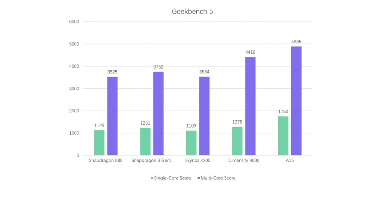 ล่าสุดนักปล่อยข่าวหลุดอย่าง Ice Universe ได้แชร์ผลการทดสอบ Geekbench 5 ผ่านทางทวิตเตอร์ของเขาที่แสดงให้เห็นว่าชิป Dimensity 9000 นั้นแซงหน้า Snapdragon 8 Gen 1 และ Exynos 2200 ทั้ง single และ multi core