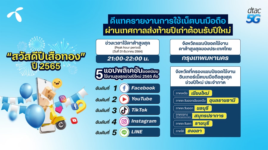 ดีแทค รายงานการใช้งานอินเทอร์เน็ตบนมือถือผ่านยอดสวัสดีปีใหม่ 2565 สวัสดีปีเสือทอง คนใช้งานดาต้าอวยพรหนาแน่นช่วง 21.00-22.00 น. ยอดดาต้าใช้งานสูงสุด “กรุงเทพมหานคร” ยังครองแชมป์ต่อเนื่อง พร้อมเผย 5 แอปพลิเคชันยอดนิยมที่ครองใจคนใช้งานสูงสุดช่วงเทศกาล