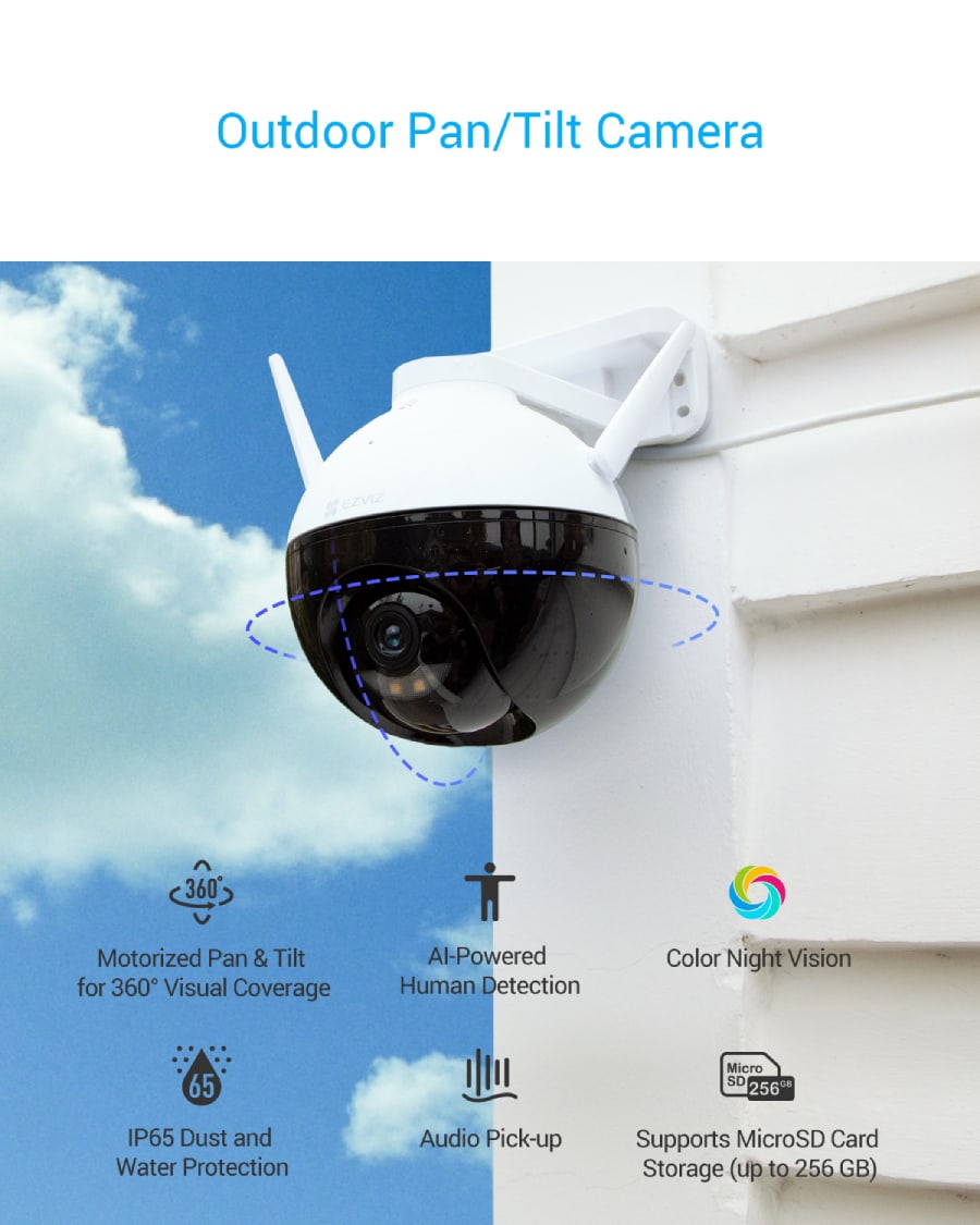 EZVIZ C8C เทคโนโลยีกล้องวงจรปิดที่ออกแบบการหมุนได้ทั้งแนวนอนรอบทิศทาง และแบบแนวตั้งที่มากถึง 95 องศา เก็บภาพรวมของสิ่งรอบตัวอย่างง่ายดาย พร้อมเก็บรายละเอียดได้มากกว่ากล้องภายนอกทั่วไป จากเลนส์ความละเอียดสูงที่ให้ความคมชัดทั้งภาพและวิดีโอได้มากถึง 1080p กล้องรุ่น C8C ยังมาพร้อมโหมดการมองเห็นกลางคืนครบทั้ง 3 โหมด คือ แบบสีเต็มรูปแบบ, แบบขาว-ดำ และ Smart Night Vision รวมถึงการทำงานจากไฟฉุกเฉินในสปอตไลต์ทั้ง 2 ดวง เพื่อยกระดับการป้องกันเชิงรุก ส่งสัญญาณไฟกะพริบได้ทันทีเมื่อมีคนเดินผ่าน พร้อมลดการตรวจจับที่ผิดพลาดด้วยอัลกอริธึม AI อัจฉริยะ แยกแยะตรวจความเคลื่อนไหวของมนุษย์ได้อย่างเรียลไทม์ เสริมกับไมโครโฟนในตัว ช่วยตัดเสียงรบกวน ให้คุณได้ยินทุกเสียงเหตุการณ์ที่ชัดเจน ไม่ว่าคุณจะอยู่ที่ไหนก็ตาม