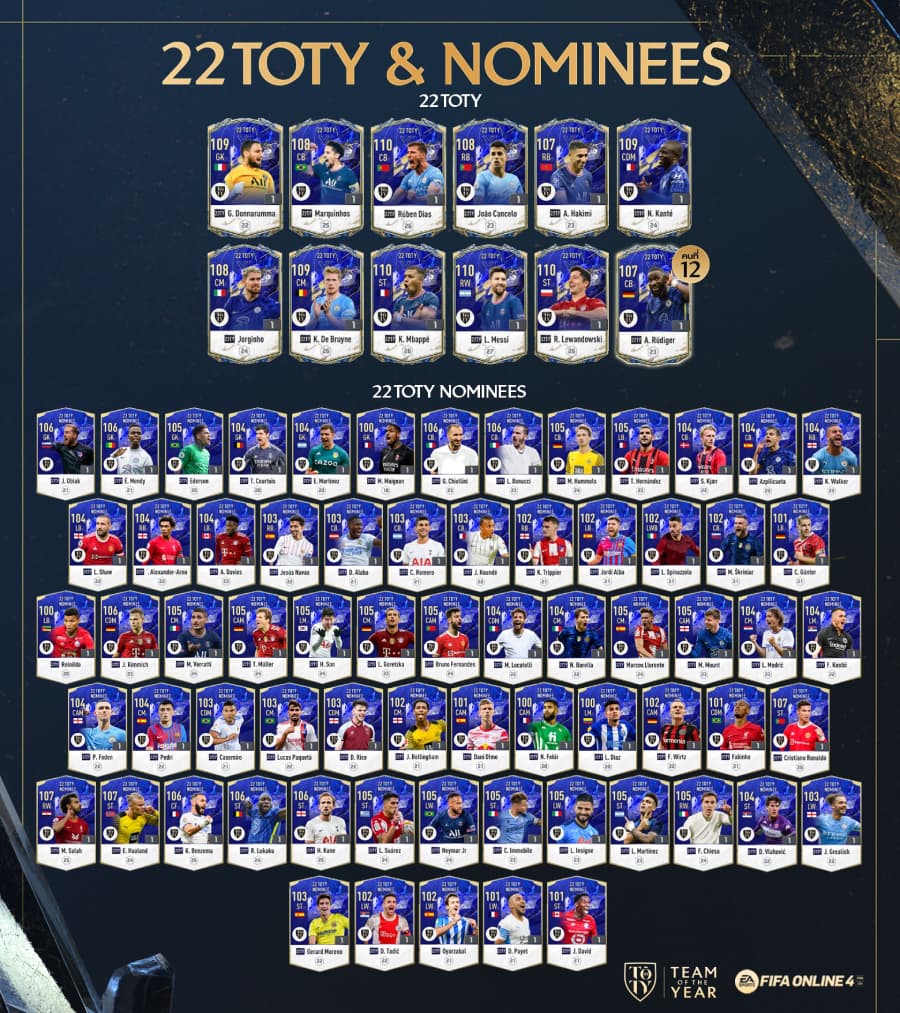 ไม่เพียงมีแต่นักเตะ 22TOTY เพียง 12 คนที่คนทั้งโลกโหวต แต่ยังมีนักเตะ 22TOTY Nominees หรือก็คือนักเตะที่ได้รับเลือกให้อยู่ในการโหวตอีกถึง 68 คน เหล่าผู้จัดการทีมสามารถเข้าไปอัปเดตเพื่อจัดทีม หานักเตะคลาสใหม่กันได้เลยในเกมฟุตบอลออนไลน์ FIFA ONLINE 4 สามารถเข้าไปดาวน์โหลด พร้อมปรับแต่งทีมประชันใน Ranking กันได้แล้ววันนี้