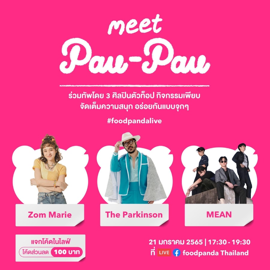 สำหรับออนไลน์แคมเปญสุดยิ่งใหญ่ต้อนรับปี 2565 “meet Pau-Pau” จะมีมหกรรมบันเทิงนำโดยเปาเปามากมาย เริ่มต้นที่มินิคอนเสิร์ตแบบ Live Streaming ในวันที่ 21 มกราคม จากเหล่าศิลปินดัง อาทิ Zom Marie ร่วมด้วย The Parkinson และ MEAN ที่จะมามอบความสุขและของรางวัลพิเศษให้ทุกคนตลอดช่วง Live Streaming เตรียมรับชมมหกรรมความสนุกพร้อมพบกับ ”เปาเปา” ตัวเป็น ๆ ได้บนเฟซบุ๊คฟู้ดแพนด้า https://www.facebook.com/FoodpandaThailand ในวันศุกร์ที่ 21 มกราคมนี้ ตั้งแต่เวลา 17.30 น. เป็นต้นไป