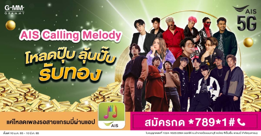จีเอ็มเอ็ม แกรมมี่ ชวนลูกค้า เอไอเอส ร่วมสนุกกับกิจกรรม AIS Calling Melody โหลดปุ๊บ ลุ้นปั๊บ รับทอง กับไผ่ พงศธร และต่าย อรทัย พิเศษสุดๆ เฉพาะลูกค้า AIS แค่ใช้บริการเพลงรอสาย AIS Calling Melody แล้วดาวน์โหลดเพลงรอสายค่ายแกรมมี่ ผ่านช่องทางแอปพลิเคชั่น AIS Calling Melody, www.CallingMelody.net, *789, Calling เหมา เหมา, *123 แกรมมี่ได้หมดเลย, *12399 แกรมมี่ คอลเซ็นเตอร์ หรือร้องคาราโอเกะเพลงค่ายแกรมมี่ผ่านแอปพลิเคชัน AIS Karaoke ก็มีสิทธิ์ลุ้นรับทองคำแท่งหนัก 1 บาท จำนวน 20 รางวัล รวมมูลค่า 573,000 บาท