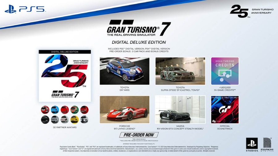 เกม “Gran Turismo 7” แบบดิจิทัลดาวน์โหลด สามารถสั่งซื้อล่วงหน้าได้แล้ววันนี้ผ่านทาง PlayStation Store (PS Store) โดยมี 2 แบบให้เลือก คือ Standard Digital Edition (PS5 และ PS4) และ 25th Annieversary Digital Edition (PS5 และ PS4) ภายในประกอบด้วยเกมฉบับเต็ม และไอเทมโบนัสพิเศษ 100,000 CR พร้อมรถโมเดลพิเศษ จำนวน 3 คัน สำหรับผู้ที่สั่งซื้อล่วงหน้าเท่านั้น